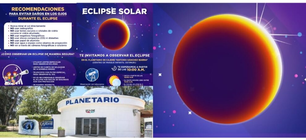 En el Planetario se ofrecerán métodos de observación indirecta, observación con telescopios y lentes especiales diseñados para un eclipse solar, además de contar con la Transmisión en Vivo del Eclipse Total y un mural informativo para aprender sobre los eclipses, entre otras actividades.De igual forma, se extienden las recomendaciones para observar el eclipse de forma segura y evitar lastimarse la vista como, tales como nunca mirar el sol directamente y está prohibido utilizar radiografías, lentes oscuros, cristales oscuros, vidrio ahumado, negativos fotográficos, CD´s, papel aluminio, agua o espejos como objeto de proyección y tampoco a través de cámaras fotográficas o celulares.