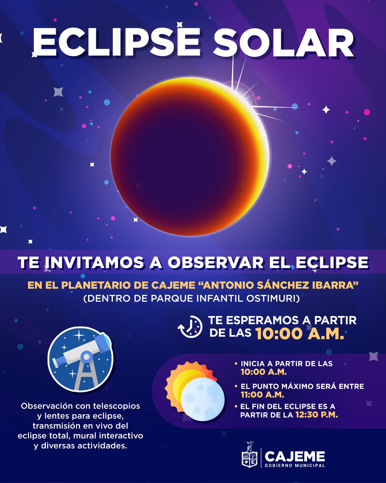 El eclipse comenzará a partir de las 10 de la mañana, alcanzará su punto máximo entre las 11:12 de la mañana y finaliza a las 12:30 del mediodía.Por lo anterior se invita a la comunidad Cajemense a observar el eclipse de forma segura en las instalaciones del Planetario “Antonio Sánchez Ibarra”, que se encuentra ubicado dentro de Parque Infantil Ostimuri a partir de las 10:00 am. Será completamente gratuito.