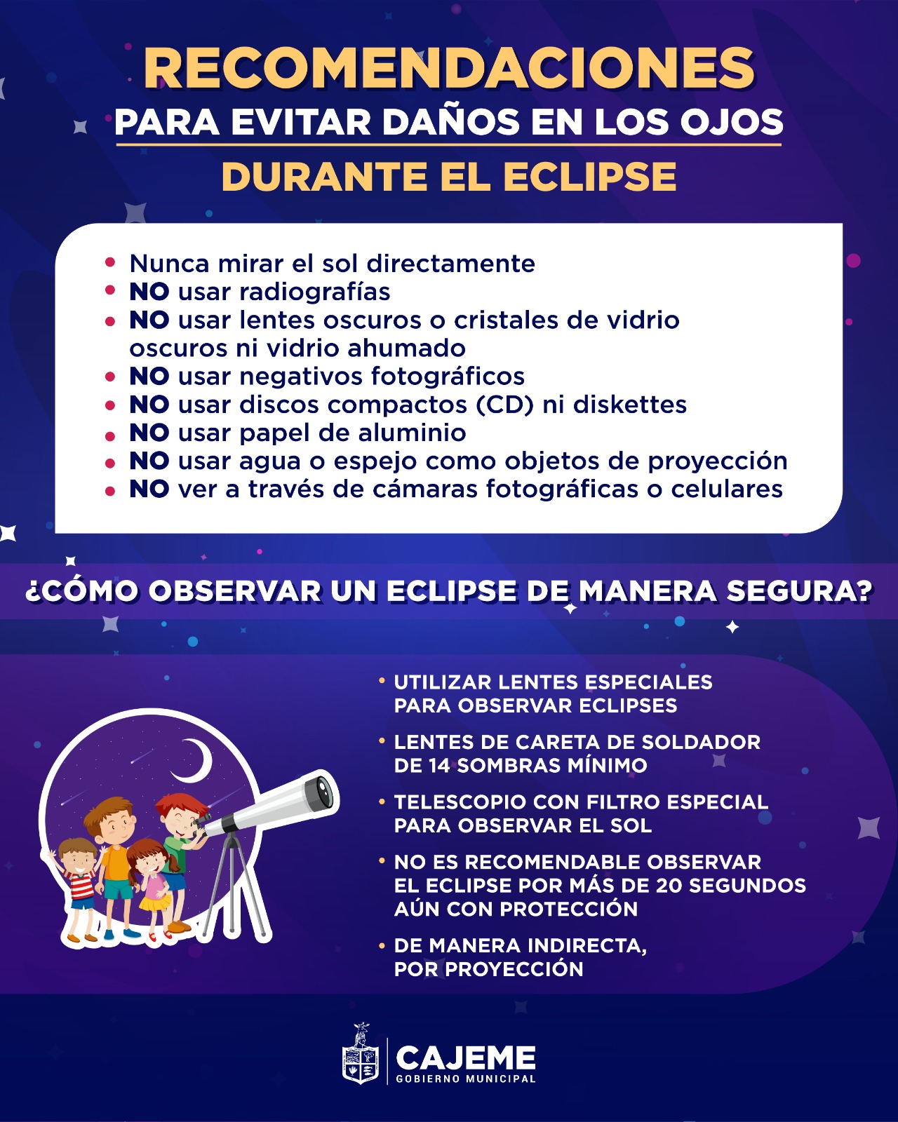 Se deben emplear lentes especiales para observar eclipses, telescopios con filtro especial para observar el sol, lentes de careta de soldador de 14 sombras mínimo y aún con protección no es recomendable observar el eclipse por más de 20 segundos.