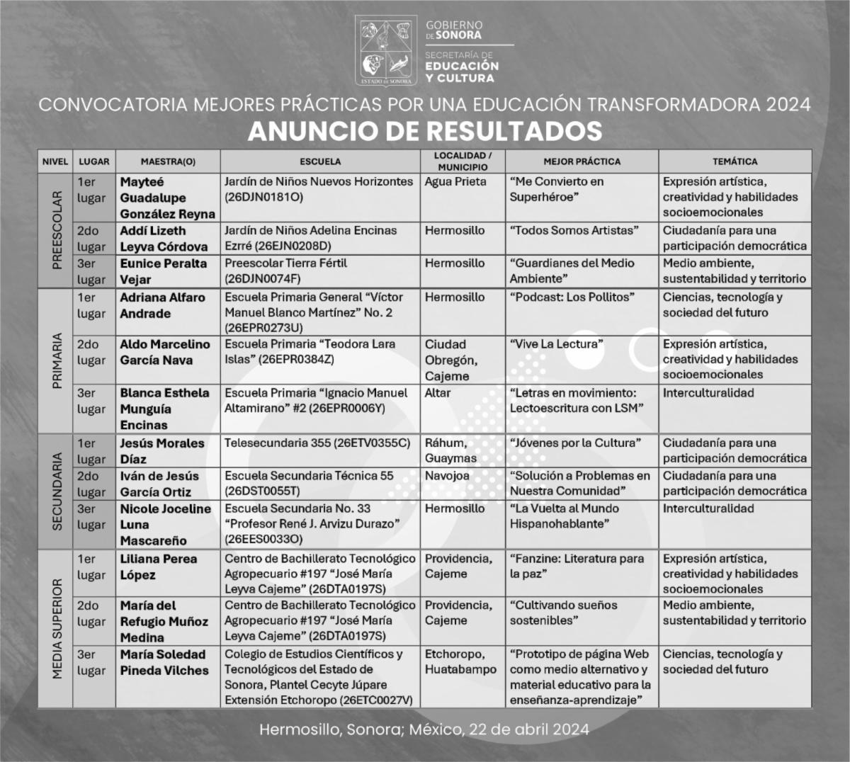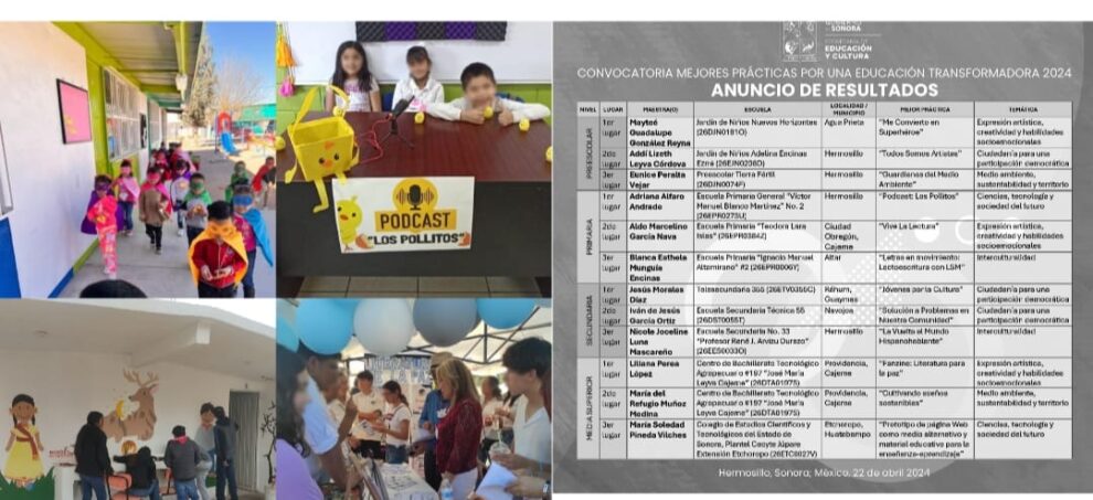 Hermosillo, Sonora; 24 de abril de 2024.- Por brindar una visión innovadora del plano académico, con el propósito de incidir en el mejoramiento del aprendizaje del alumnado, docentes de Agua Prieta, Hermosillo, Cajeme, Altar, Guaymas, Navojoa y Huatabampo, fueron seleccionados ganadores de la convocatoria “Mejores Prácticas por una Educación Transformadora”.
