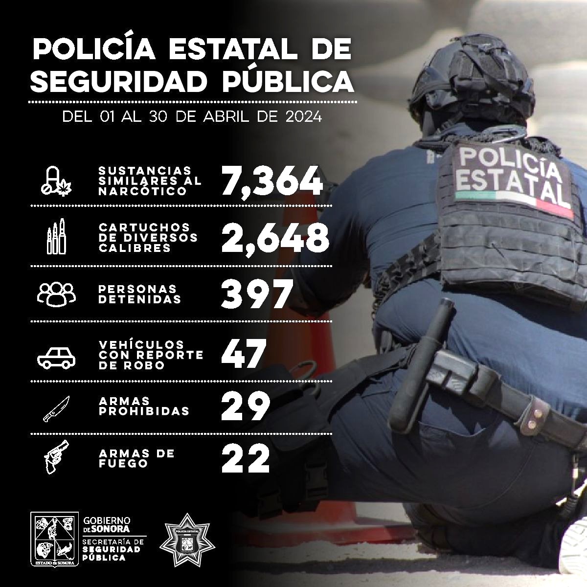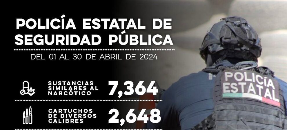 En el mes de abril, la corporación trabajó de manera coordinada con los tres niveles de gobierno en zonas con mayor incidencia delictiva y en este periodo oficiales de la PESP sacaron de las calles lo equivalente a siete mil 364 dosis de sustancias similares al narcótico y recuperaron 47 vehículos con reporte de robo.