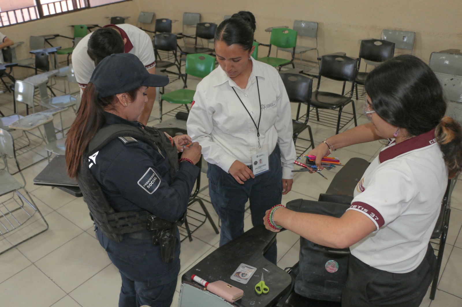 Inspeccionando alrededor de 200 mochilas, mismas que fueron revisadas por las y los estudiantes bajo la supervisión de personal de programas preventivos, cadetes y agentes de la corporación en compañía de trabajadores del plantel educativo, garantizaron un entorno seguro y tranquilo dentro de la institución.