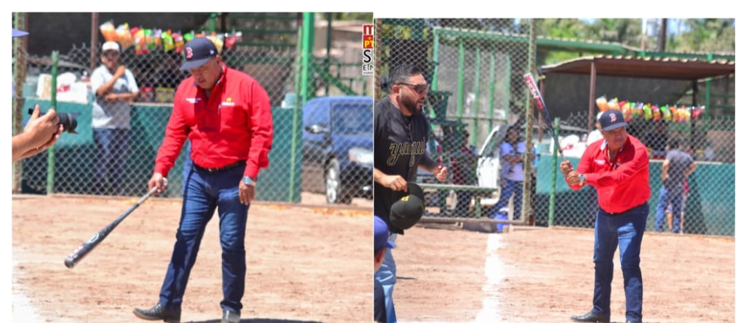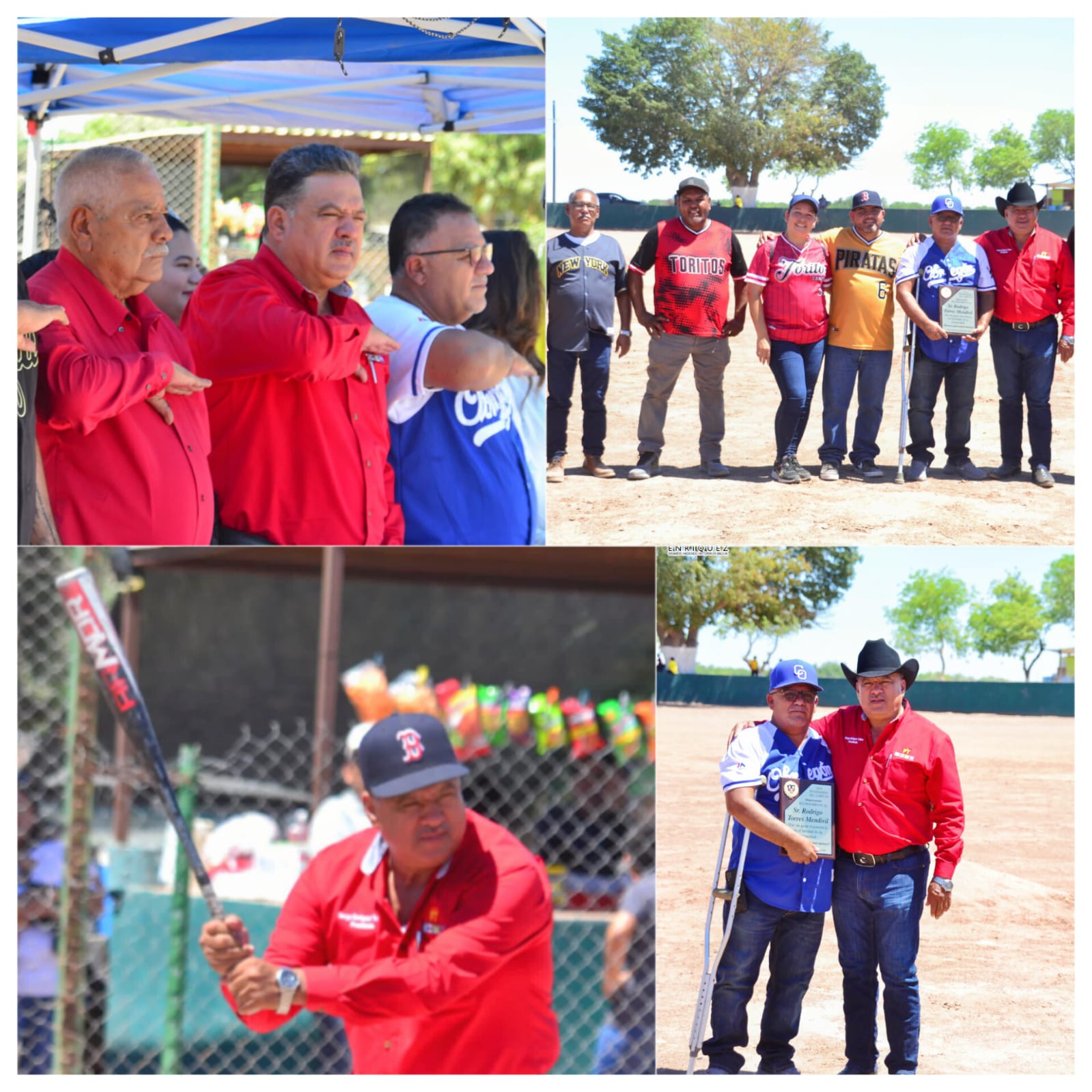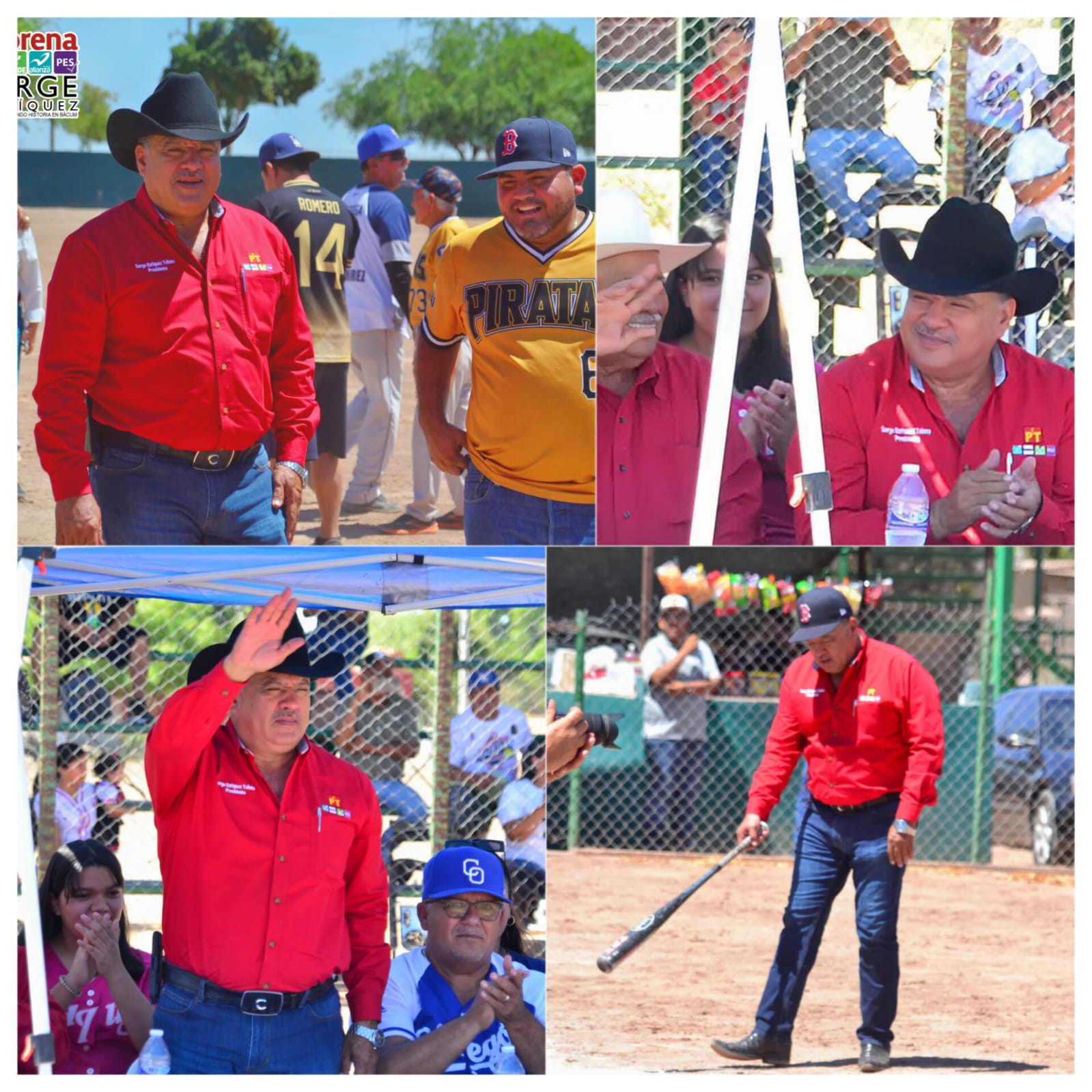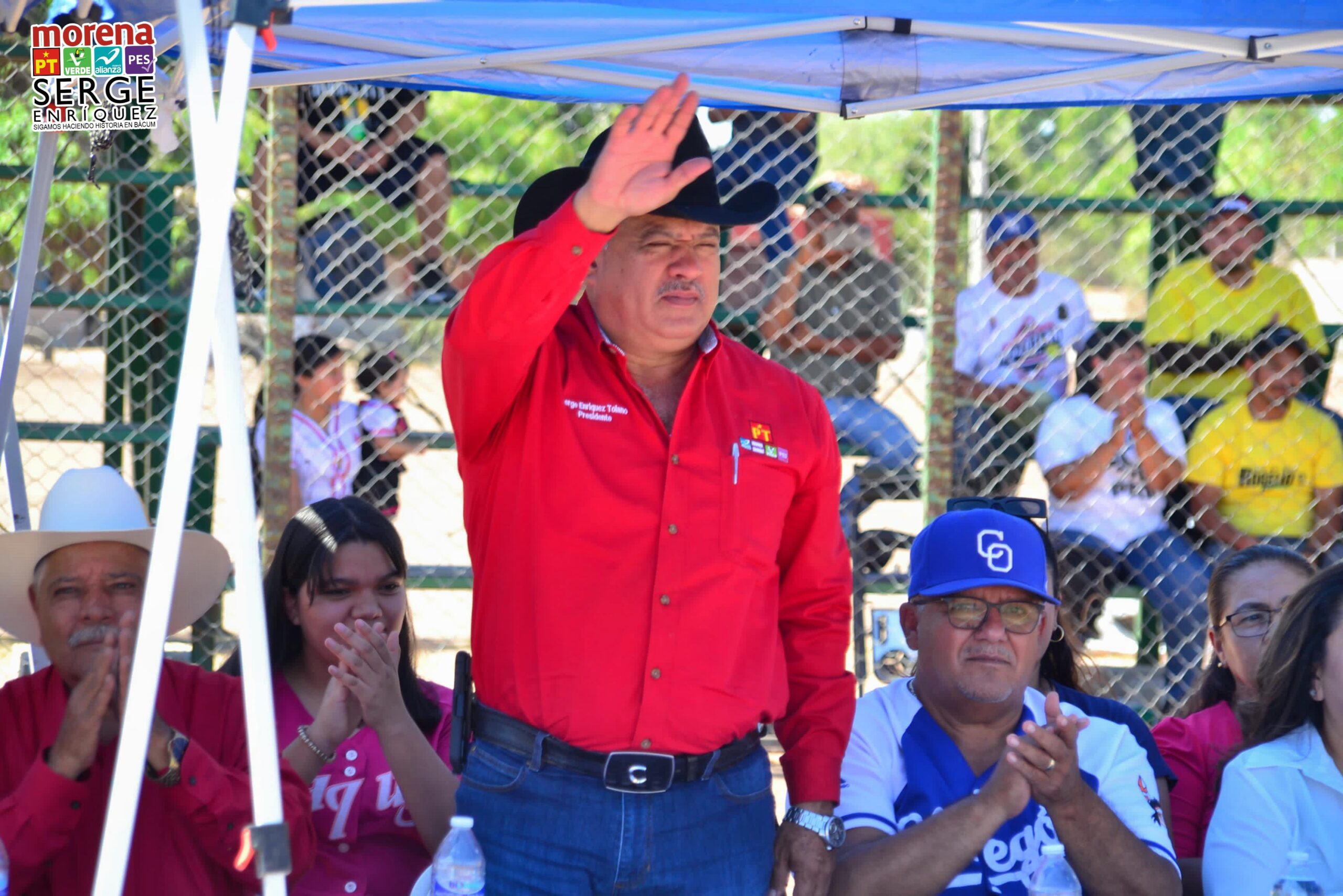 BACUM, SONORA. 19 DE MAYO DE 2024.- Serge Enríquez, candidato a la alcaldía de Bácum, por la coalición ´´ Sigamos Haciendo Historia,´´ acudió este domingo a la puesta en marcha de la liga interna de beisbol del campo 60, donde los jugadores de los equipos participantes respaldaron y apoyaron su intención de triunfar en los próximos comicios del 2 de Junio próximo.