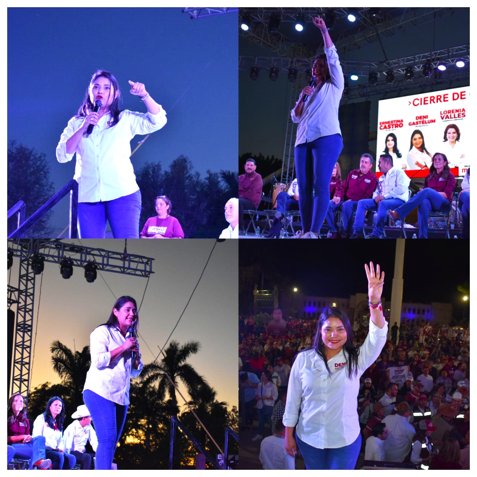 Durante su discurso, Deni Gastelum se mostró confiada y agradecida por el apoyo recibido a lo largo de la campaña. “Este es el momento de demostrar que la esperanza sigue viva en Sonora, Cajeme y especialmente en el distrito 16. Los invito a todos a pintar todo de guinda este 2 de junio. Juntos, lograremos la transformación que nuestra comunidad necesita”, declaró con fervor.