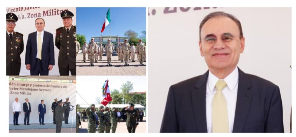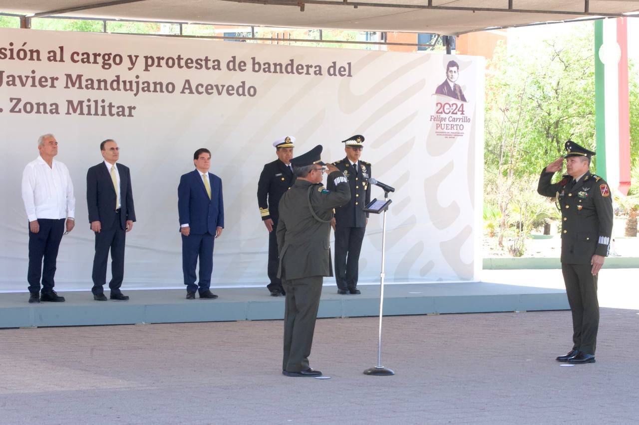 Hermosillo, Sonora; 3 de junio de 2024.- Como parte de la coordinación que existe entre las autoridades de los tres órdenes de gobierno, a través de las reuniones diarias de la Mesa Estatal de Seguridad, el gobernador Alfonso Durazo Montaño encabezó la ceremonia de toma de posesión al cargo y protesta de bandera de Vicente Javier Mandujano Acevedo como nuevo comandante de la Cuarta Zona Militar.