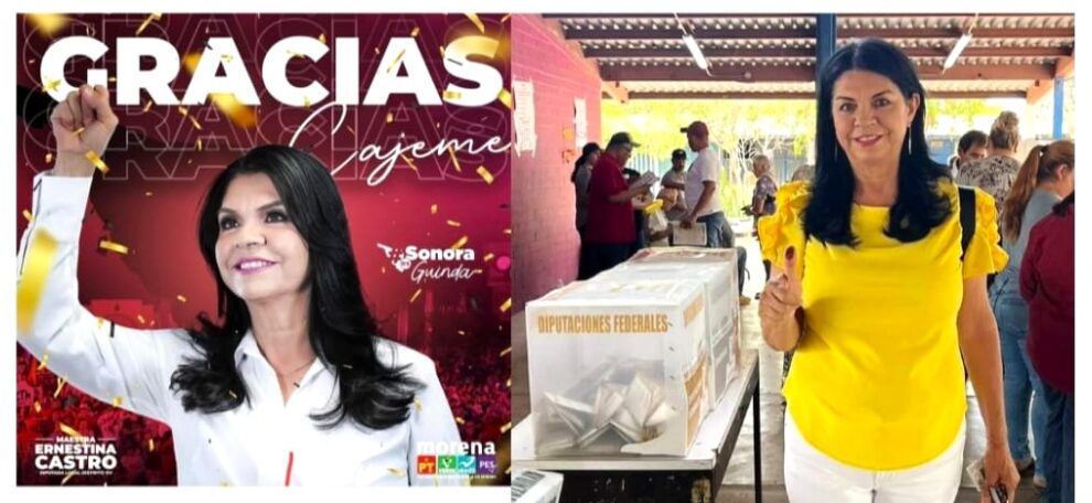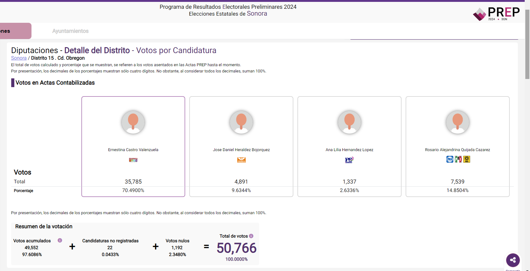 HERMOSILLO, SONORA 4 DE JUNIO DE 2024.- El Programa de Resultados Preliminares 2024, de las Elecciones Estatales de Sonora, arrojó resultados de paquetes electorales de las diputaciones locales donde por el partido Movimiento de Regeneración Nacional (Morena), Ernestina Castro, resultó la ganadora en el Distrito Local 15 Cajeme, con 35 mil 785 votos que representa el 70.49 por ciento.