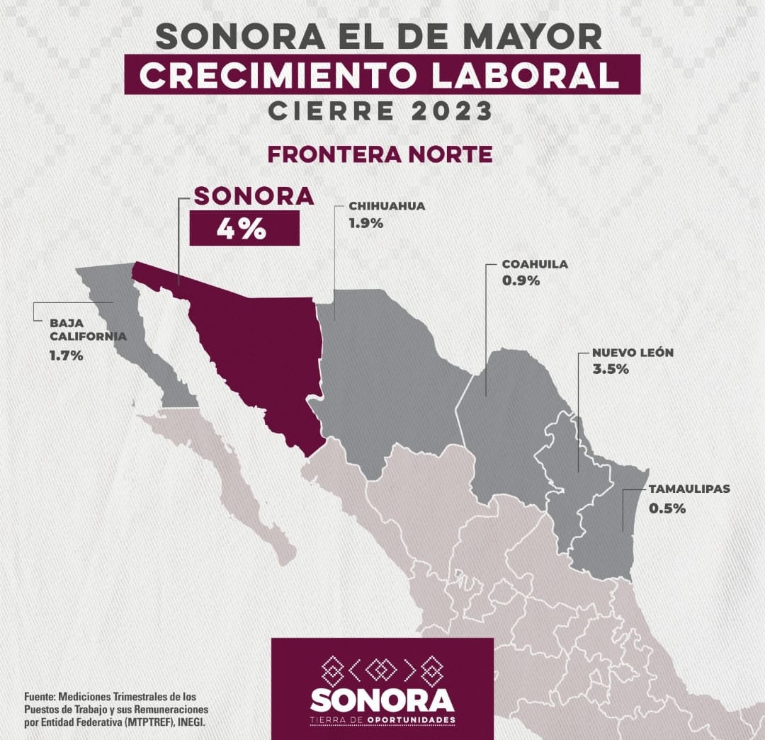 El mandatario estatal, detalló que, de acuerdo con el Instituto Nacional de Estadística y Geografía (Inegi), en el último balance trimestral del 2023, se reportó dicho incremento y, derivado de la llegada de inversión extranjera directa, se han formalizado más y mejores oportunidades de empleos para las y los sonorenses.