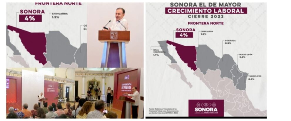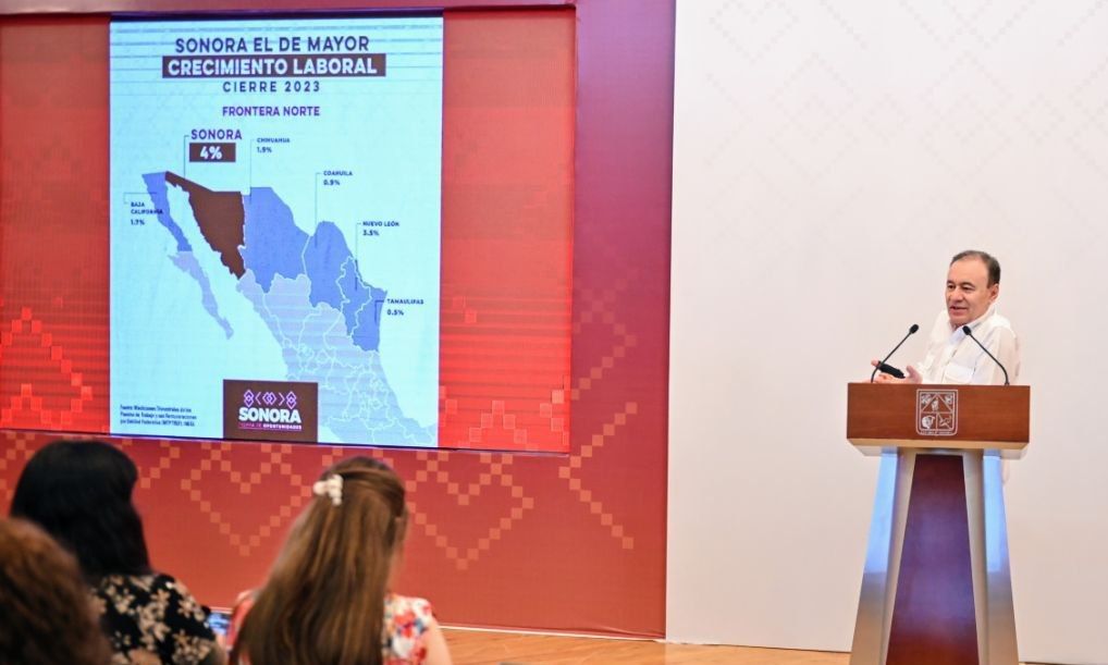 HERMOSILLO, SONORA 4 DE JUNIO DE 2024.- Sonora destaca como el estado líder de la frontera norte del país con mayor crecimiento laboral al cierre del 2023, al registrar un incremento del cuatro por ciento en los puestos de trabajo ocupados en la entidad, indicó el gobernador Alfonso Durazo Montaño.