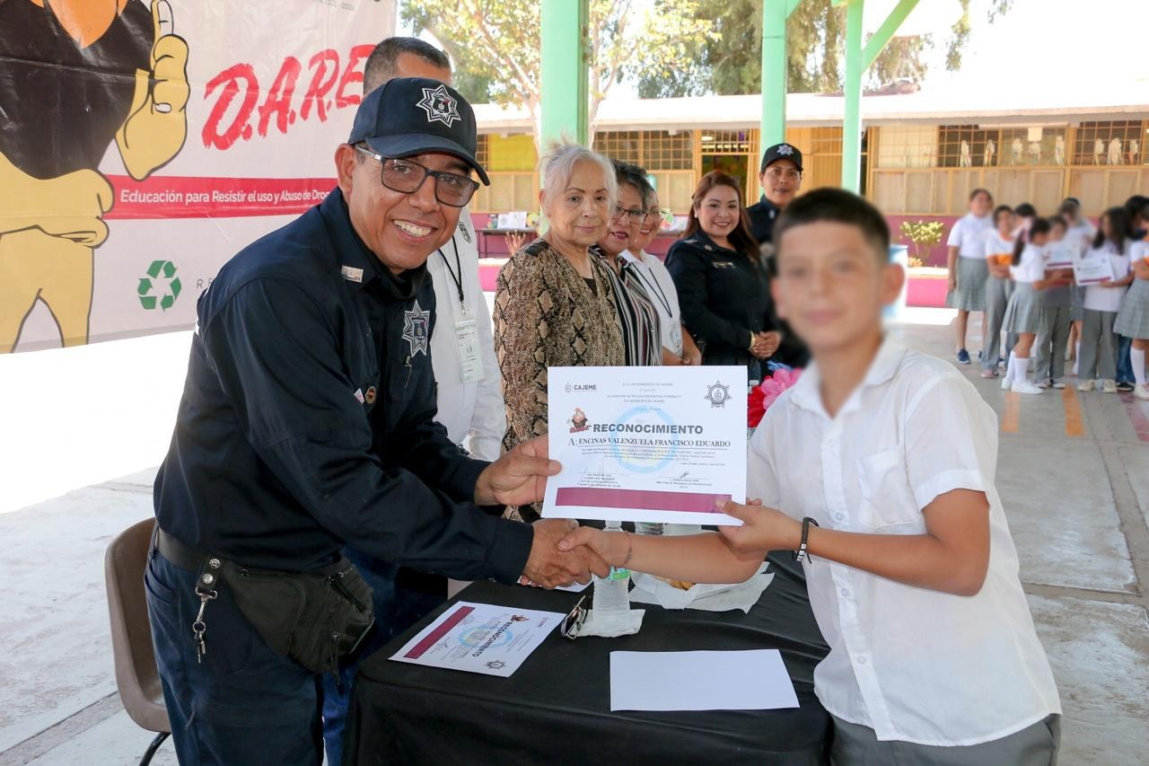 Dominga Bravo Peña, Directora de Programas Preventivos de la corporación policial, informó que las y los estudiantes llevaron durante 10 semanas pláticas preventivas por oficiales DARE, aprendiendo las herramientas necesarias para su autocuidado y la toma de decisiones responsables.“A través de las lecciones, las niñas y niños aprendieron técnicas y estrategias para mantenerse seguros y saludables, evitando situaciones de riesgo relacionadas con las drogas y la violencia”, enfatizó.