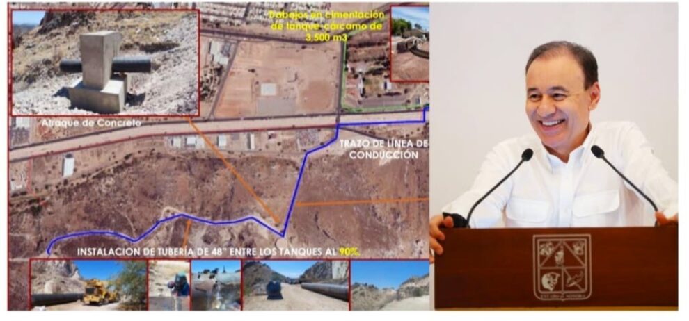 El mandatario sonorense detalló que los trabajos de la obra se realizan en el cerro de la Cementera, al oriente de la ciudad y, se finalizarán dentro de 10 días.Explicó que, para ello, la Comisión Estatal del Agua (CEA) aprovechó una tubería que ya estaba en existencia y desuso en la zona.