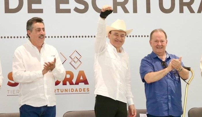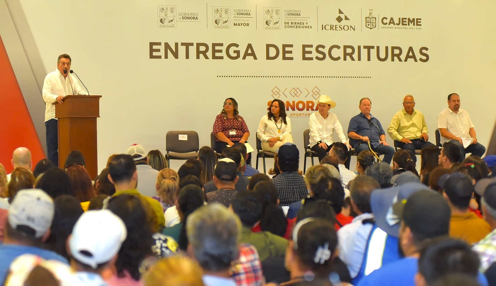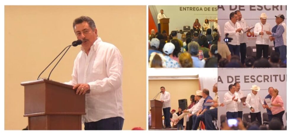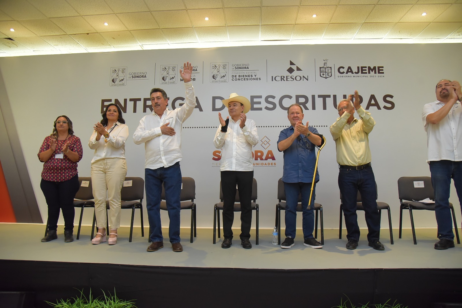 CIUDAD OBREGÓN, SONORA 24 DE JUNIO DE 2024.– El Presidente Municipal de Cajeme, Javier Lamarque Cano, acompañó al Gobernador del Estado de Sonora, Dr. Alfonso Durazo Montaño a la entrega de escrituras para la regularización de asentamientos urbanos a familias que habitan en el Rodeo 3 y colonias de San Ignacio Río Muerto.