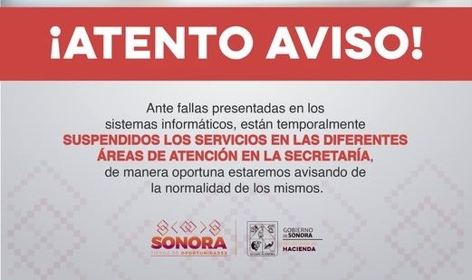 HERMOSILLO, SONORA 28 DE JUNIO DE 2024.- . La Secretaría de Hacienda informa que el día 26 de junio a las 19:20 horas, durante una copia de seguridad automática en nuestro centro de datos, se presentaron intermitencias eléctricas, lo que provocó la interrupción de los sistemas de servicio y atención a los contribuyentes, tanto en línea como en las Agencias y Sub Agencias Fiscales, así como en el Instituto Catastral y Registral del Estado de Sonora (ICRESON).