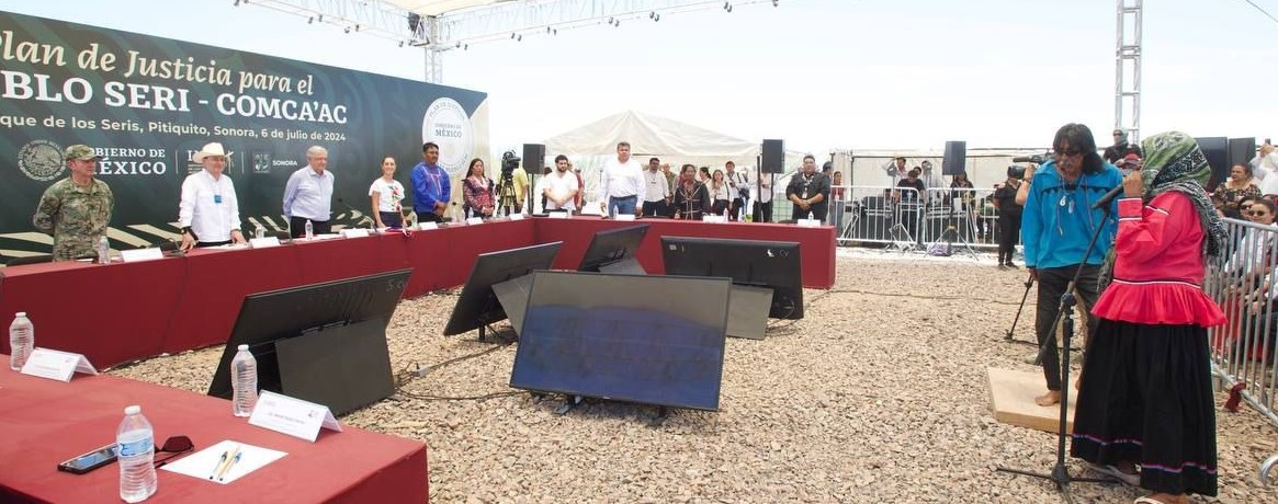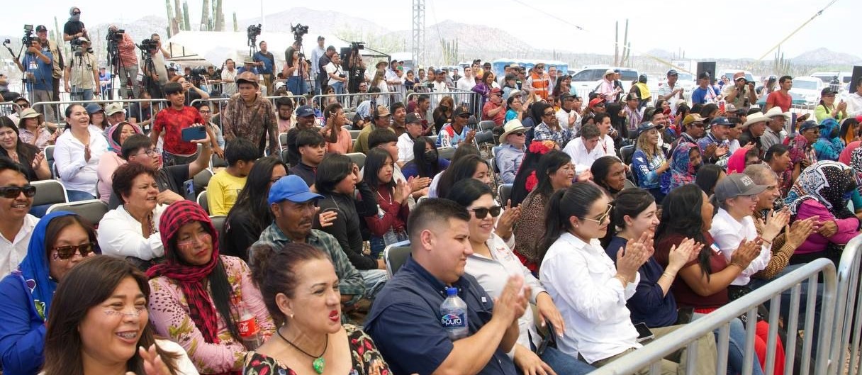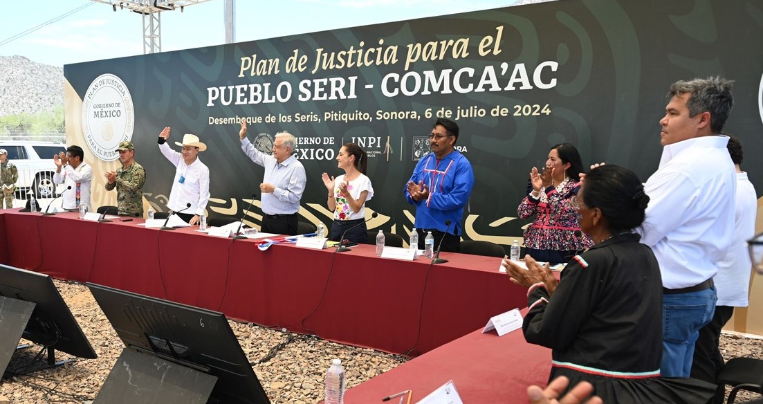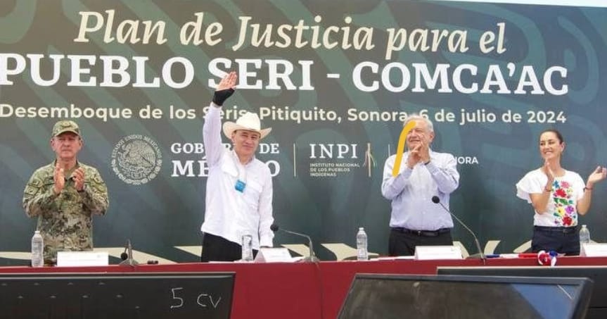 El mandatario sonorense destacó que es la cuarta visita del presidente López Obrador a Territorio Seri y agradeció a la presidenta electa Sheinbaum haber asumido desde su etapa como candidata, el compromiso con dar continuidad a los planes de justicia para la etnia Seri.