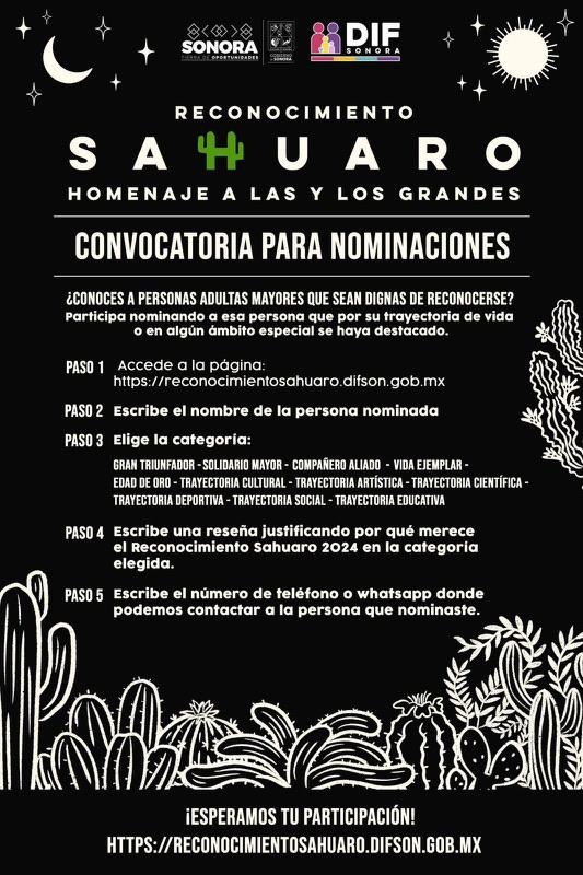 La convocatoria está abierta y disponible en el sitio https://difson.gob.mx hasta el 13 de agosto, una vez que los interesados accedan a la página web es necesario escribir una reseña sobre el por qué merece el reconocimiento Sahuaro y proporcionar los datos que ahí se indican, para mayor información favor de comunicarse a: Tel: (662) 1186131 o 35.