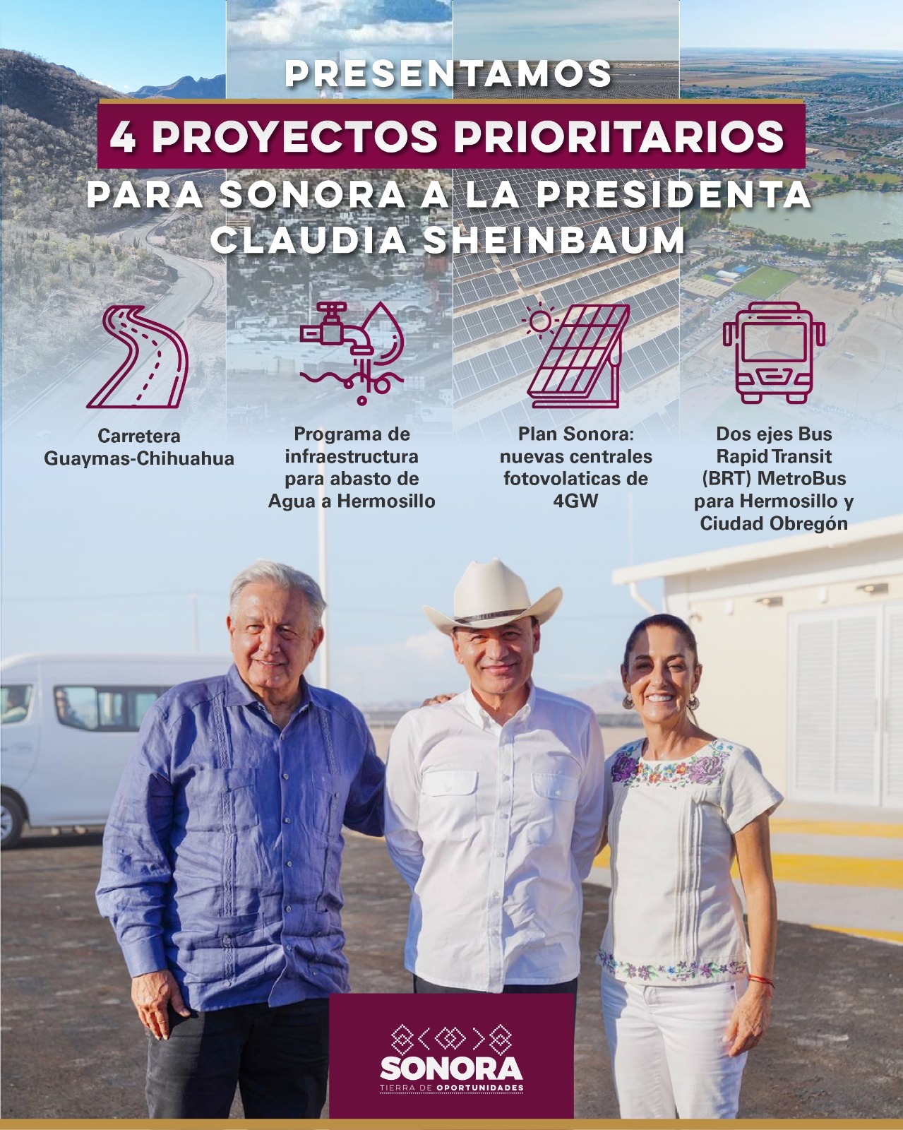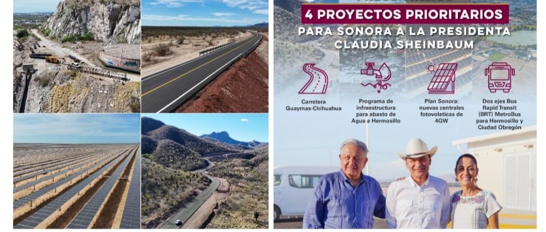 Por último, se expuso el Proyecto BRT (Bus Rapid Transit ) para Hermosillo y Ciudad Obregón, el cual contempla una inversión de dos mil 989 millones de pesos y consiste en establecer un Sistema de Transporte eficiente y moderno para las ciudades de Hermosillo y Ciudad Obregón. Ello mediante carriles confinados (siempre y cuando la infraestructura de la zona lo permita) y estaciones que faciliten el resguardo de los usuarios.