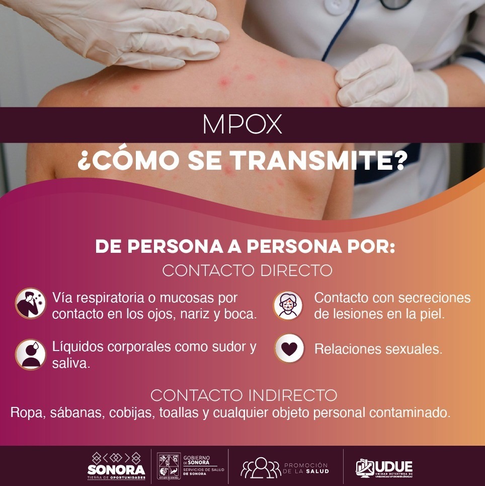 La MPOX se transmite por contacto físico “estrecho” de persona a persona, y esto consiste en: contacto con los líquidos corporales como sudor y saliva; vía respiratoria o mucosa por contacto en ojos nariz y boca; lesiones en la piel y relaciones sexuales. Así como el contacto directo con secreciones y fluidos de un paciente con la enfermedad a través de su ropa, sábanas, toallas y otros elementos que pueden contener dichas secreciones, esto último sobre todo en el ambiente hospitalario de atención.Se invita a la población a mantenerse informada a través de canales oficiales e institucionales.