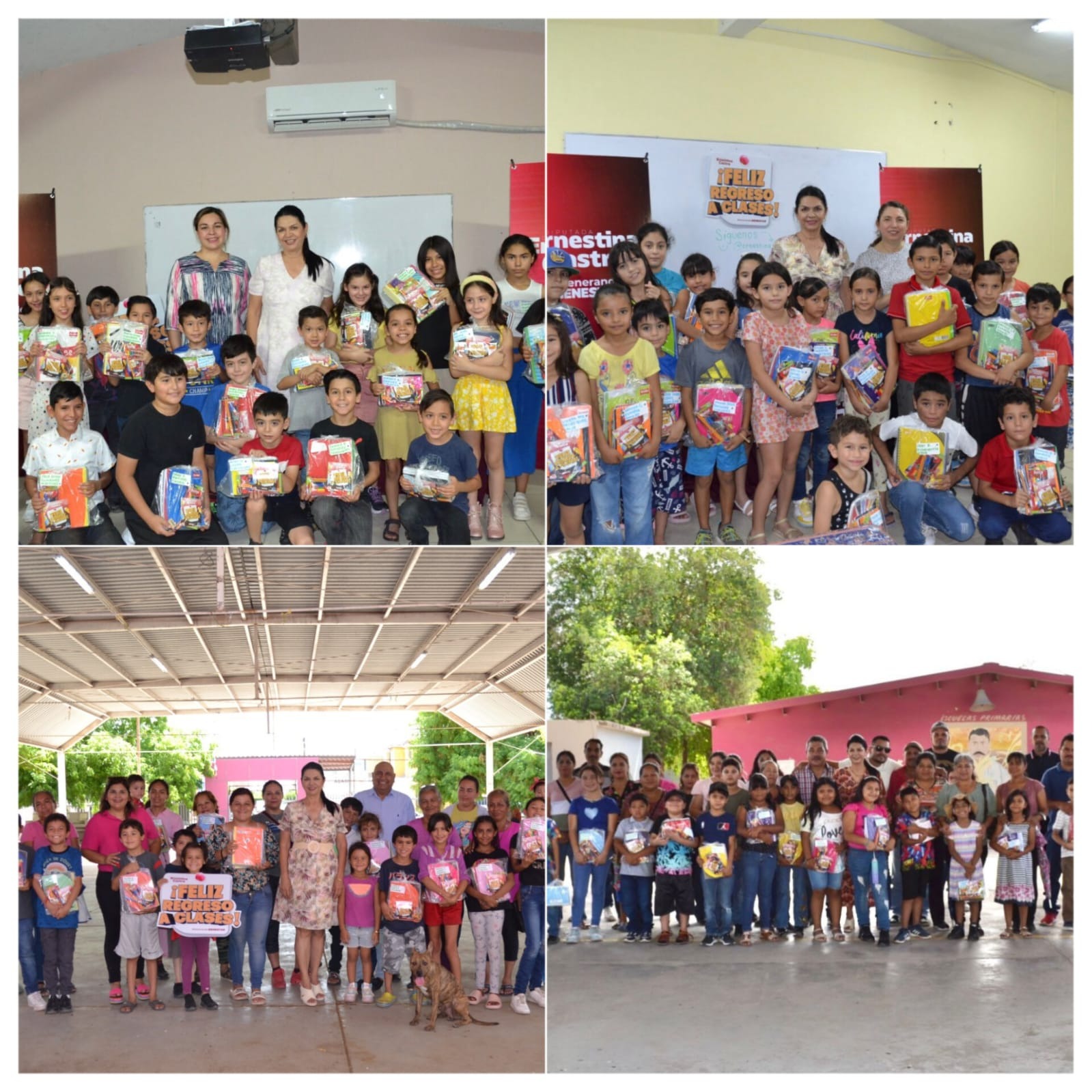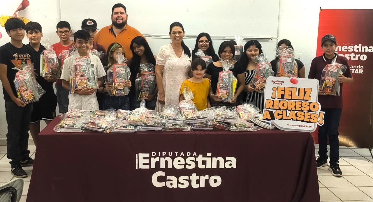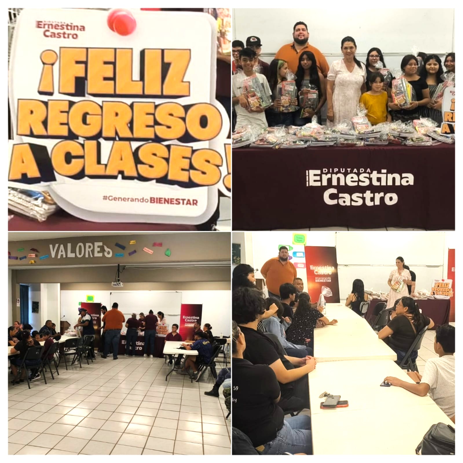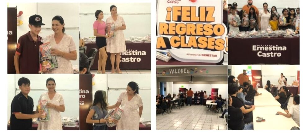 Ernestina Castro y su equipo de trabajo hicieron posible la entrega de paquetes y útiles escolares a los alumnos de  20 escuelas, entre ellas  5 secundarias y 15 primarias, donde los directores y padres de familia  de los planteles escolares solicitaron a la diputada Castro Valenzuela, los apoyos escolares  que servirán para los estudiantes de nivel básico  una gran  herramienta  para su aprovechamiento en el ciclo que hoy inicia.