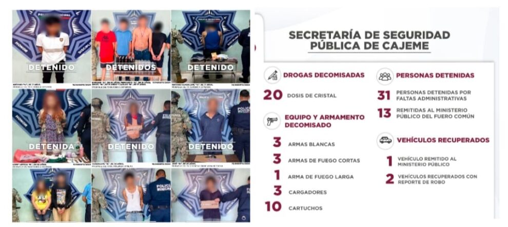 Las acciones de la Secretaría de Seguridad Pública en Cajeme dieron como resultado un total de 44 personas detenidas por elementos de la Policía Municipal en coordinación con la Secretaría de Marina y las diversas corporaciones, de los cuales 31 fueron por faltas administrativas y 13 se turnaron al Ministerio Público del Fuero Común.
