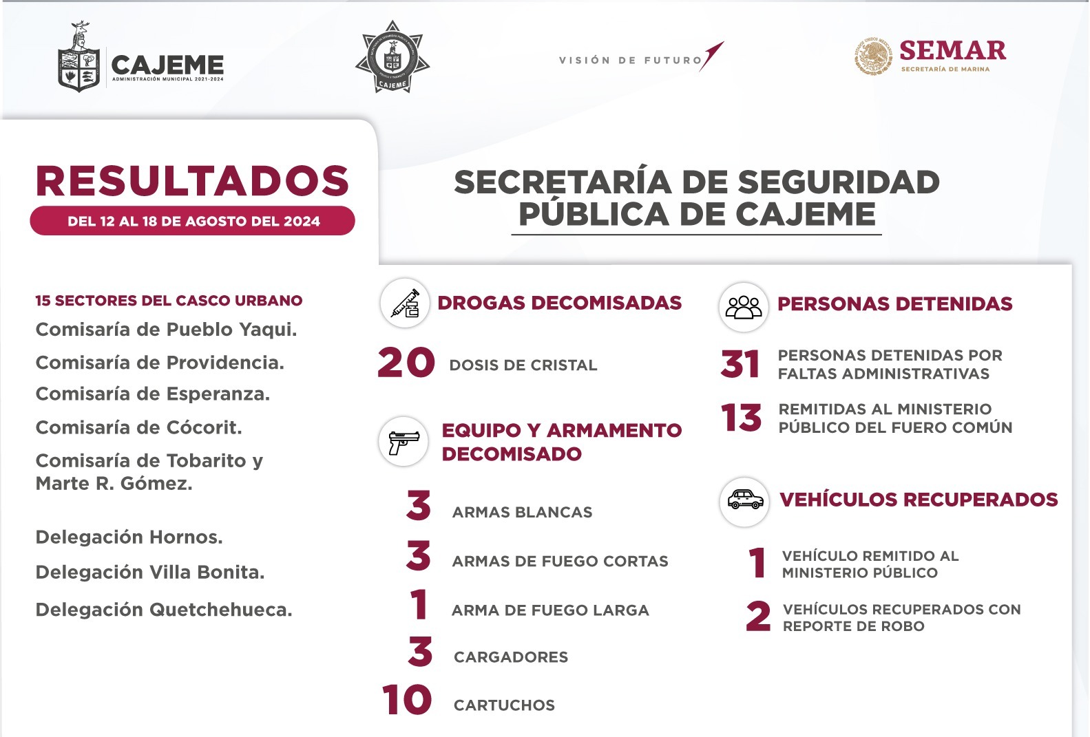 +Semana de labores del 12 al 18 de agosto del 2024+Cajeme contigo es seguro no te calles y denuncia al 911 o 089