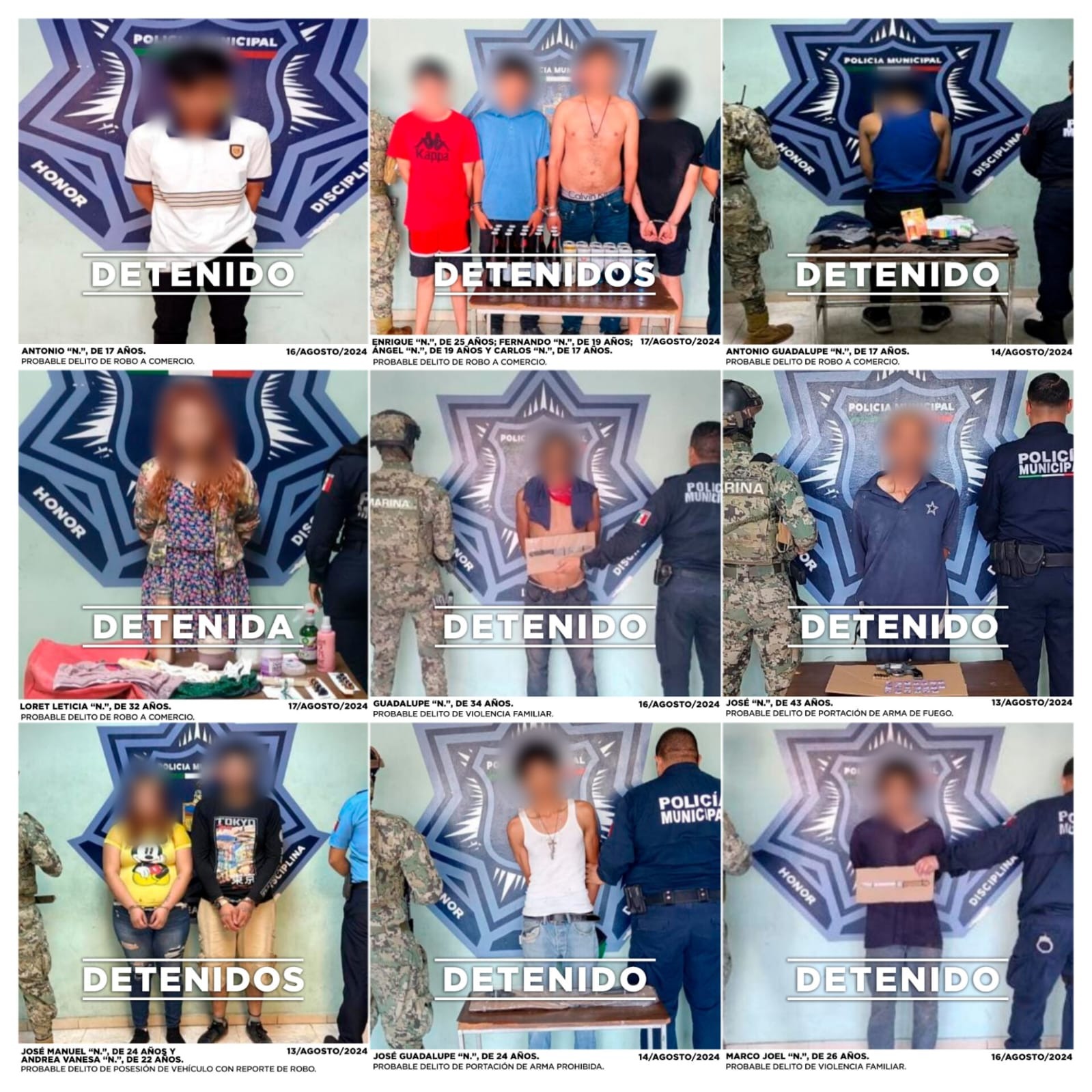 Los detenidos fueron identificados como José “N.”, de 43 años, por el probable delito de portación de arma de fuego; José Manuel “N.”, de 24 años y Andrea Vanesa “N.”, de 22 años, probable delito de posesión de vehículo con reporte de robo; José Guadalupe “N.”, de 24 años, probable delito de portación de arma prohibida y Antonio Guadalupe “N.”, de 17 años, probable delito de robo a comercio.Además de Antonio “N.”, de 17 años, probable delito de robo a comercio; Marco Joel “N.”, de 26 años, probable delito de violencia familiar; Guadalupe “N.”, de 34 años, probable delito de violencia familiar; Enrique “N.”, de 25 años; Fernando “N.”, de 19 años; Ángel “N.”, de 19 años y Carlos “N.”, de 17 años, probable delito de robo a comercio y Loret Leticia “N.”, de 32 años, probable delito de robo a comercio; entre otros.