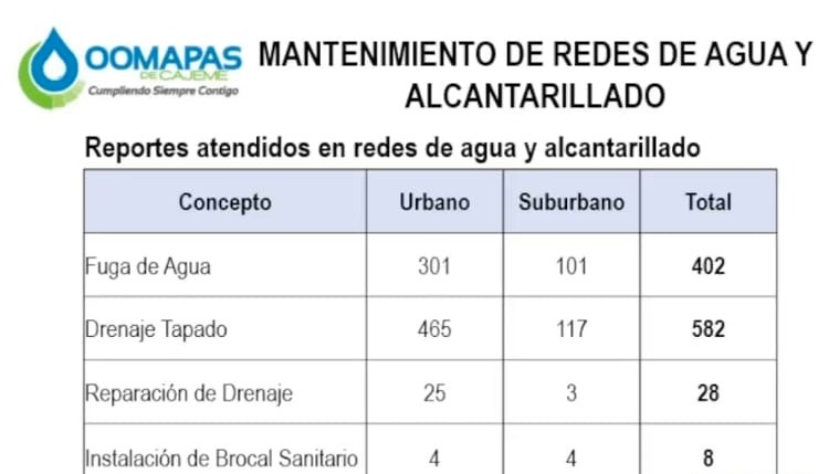 El Director Técnico de Oomapasc, Fructuoso Méndez Valenzuela, informó que tan solo del 8 al 22 de agosto se atendieron 402 fugas de agua, 582 drenajes tapados, y la reparación de 28 puntos de tubería sanitaria en distintas colonias de la ciudad y la zona suburbana, además del cambio de 8 brocales o tapaderas de alcantarillas.