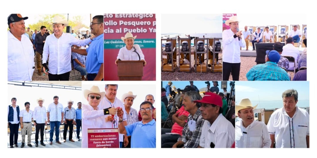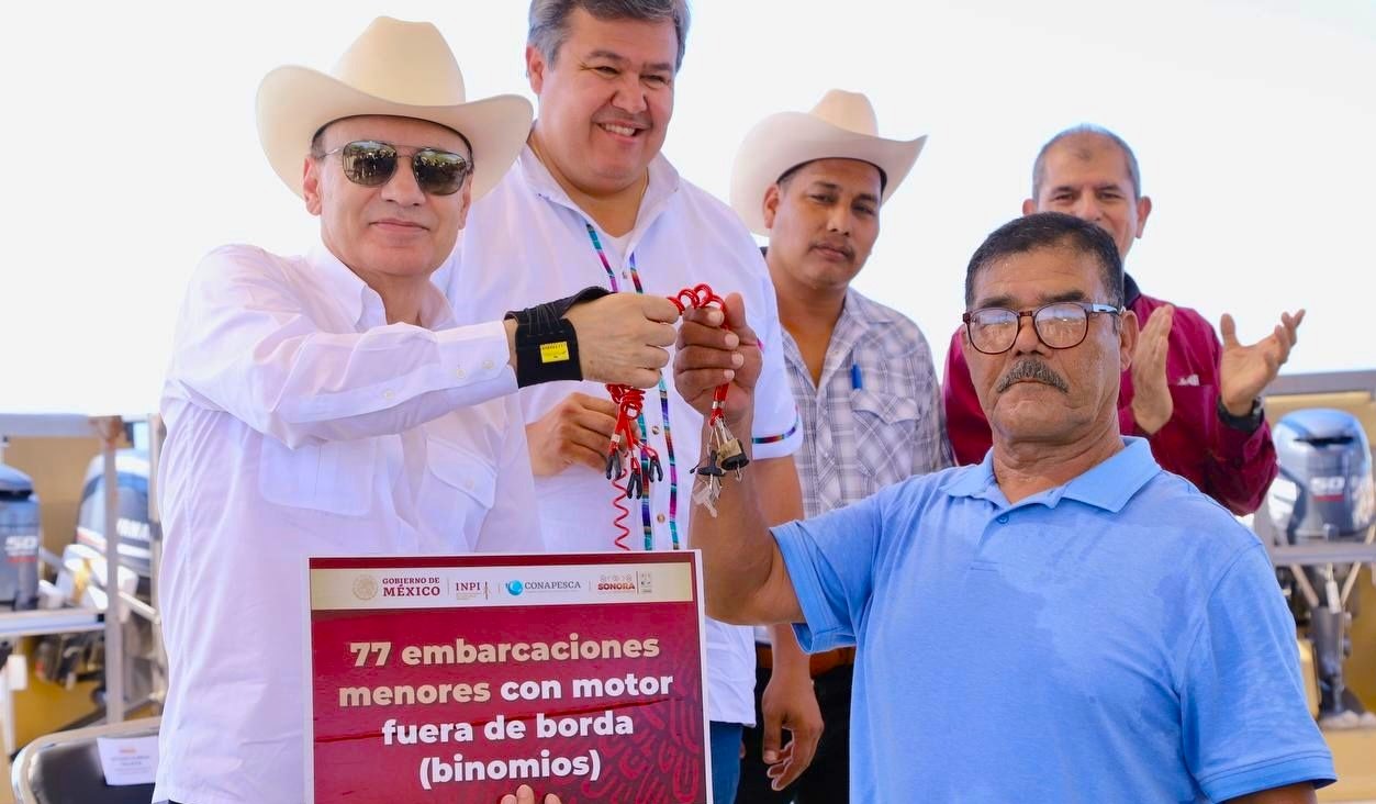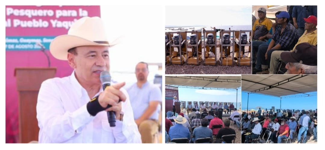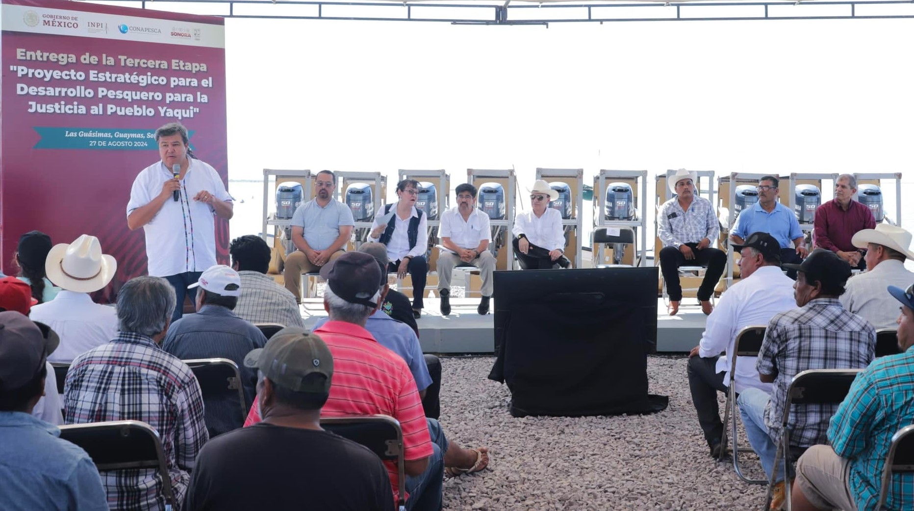 LAS GUÁSIMAS , SONORA 27 DE AGOSTO DE 2024.- En cumplimiento al Proyecto Estratégico para el Desarrollo Pesquero para Justicia del Pueblo Yaqui, el gobernador Alfonso Durazo Montaño y el Comisionado Nacional de Acuacultura y Pesca (Conapesca), Octavio Almada Palafox, entregaron 77 embarcaciones y 77 motores fuera de borda, que en su conjunto forman un binomio, a pescadores de Las Guásimas con lo que suman 303 equipos con una inversión de 106.8 millones de pesos.