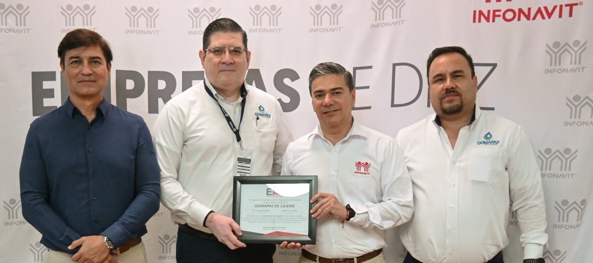 CIUDAD OBREGÓN, SONORA 14 DE OCTUBRE DE 2024.- El Organismo Operador Municipal de Agua Potable, Alcantarillado y Saneamiento de Cajeme, fue reconocido por segundo año consecutivo como “Empresa de Diez” por parte del Instituto del Fondo Nacional de la Vivienda para los Trabajadores (INFONAVIT).