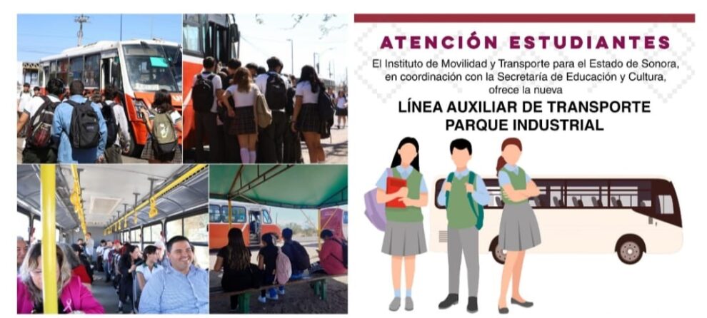 La Línea Auxiliar de Transporte Parque Industrial transitará por las colonias Nuevo Hermosillo, Gala, Las Lomas, Pedregal de la Villa, Las Diligencias e Y Griega, ofreciendo el servicio con tres unidades en dos turnos: de 12:00 a 14:30 y de 19:00 a 21:00 horas, tiempos identificados y que requirieron se reforzará la movilidad a la comunidad estudiantil.