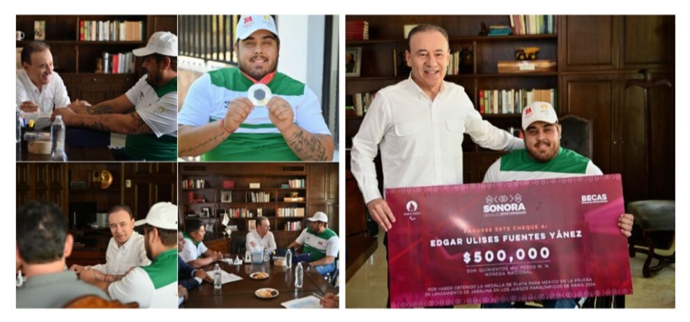 Hermosillo, Sonora; 18 de octubre de 2024.- Donde sea que se encuentre un sonorense que destaque, este contará con el respaldo incondicional del Gobierno de Sonora para que siga con su desarrollo profesional y personal, resaltó el gobernador Alfonso Durazo Montaño al entregar un estímulo económico de 500 mil pesos a Edgar Ulises Fuentes Yáñez, ganador de la medalla de plata en lanzamiento de jabalina en los Juegos Paralímpicos París 2024.