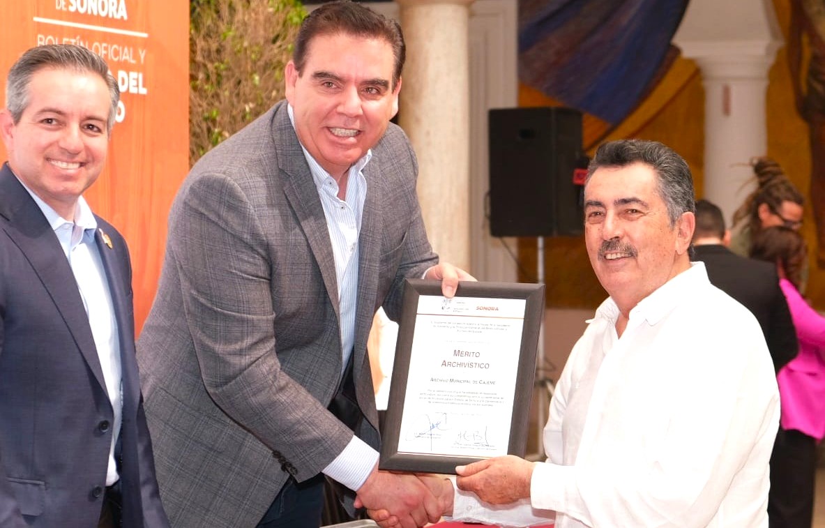 HERMOSILLO, SONORA. 23 DE OCTUBRE DE 2024.– Por su compromiso con la preservación y gestión documental en el ámbito archivístico, el Presidente Municipal, Javier Lamarque en representación del Ayuntamiento de Cajeme recibió un reconocimiento al Mérito Archivístico por parte de las autoridades estatales, en el marco de la celebración del 40 Aniversario de la Integración del Archivo del Estado de Sonora.