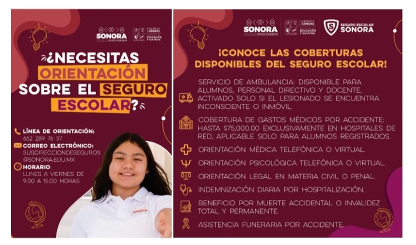 Puntualizó que, para recibir información sobre el seguro escolar, la SEC cuenta con la Línea de Orientación: 662 289 76 37 y por correo electrónico se brinda asesoramiento en: subdirecciondeseguros@sonora.edu.mx.