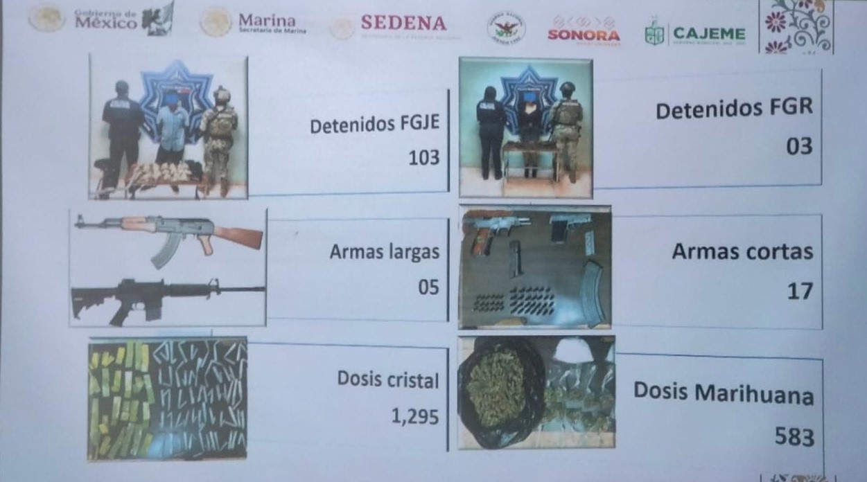 Por lo que, durante lo que va del mes de octubre, el personal operativo ha logrado la captura de 106 personas en total, así como el decomiso de 5 armas largas, 17 armas cortas, 5 armas blancas, mil 295 dosis de cristal y 583 dosis de marihuana, así como el aseguramiento de 24 vehículos y 33 motocicletas.Además de 157 personas detenidas al bando, 17 órdenes de cateo, 18 migrantes rescatados y 9 vehículos recuperados.