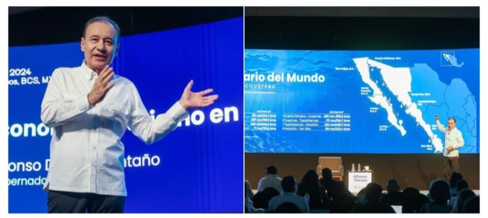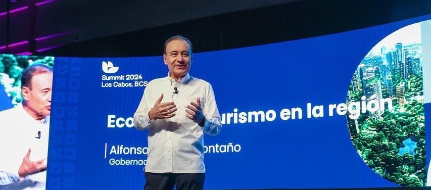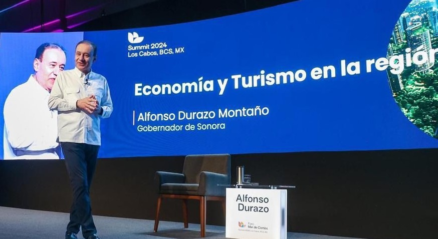 HERMOSILLO, SONORA. 16 DE NOVIEMBRE DE 2024.– Durante la presentación de su conferencia Economía y Turismo en la Región en el Foro Mar de Cortés, Summit 2024, Ciudades con Futuro, que se desarrolla en Los Cabos, Baja California Sur, el gobernador Alfonso Durazo Montaño resaltó las virtudes del Plan Sonora de Energías Sostenibles al describir las oportunidades de crecimiento económico que ha brindado al estado desde su implementación, al inicio de su administración.