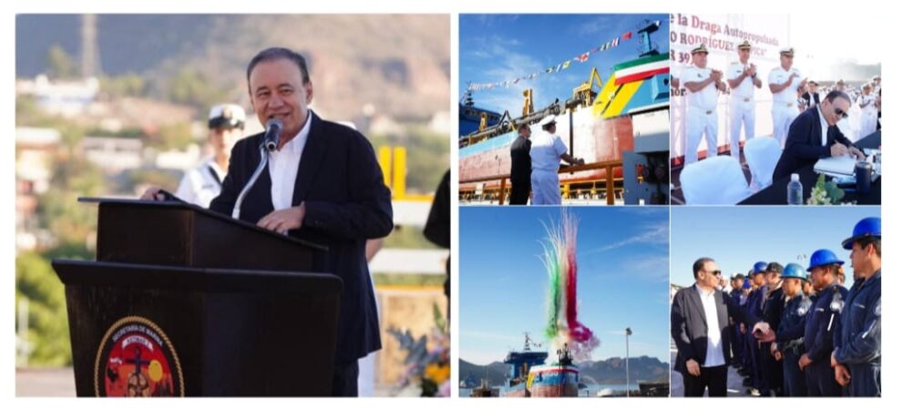 El mandatario estatal encabezó la ceremonia de botadura de draga auto propulsada “Capitán Hilario Rodríguez Malpica” (ADR-39), un navío ensamblado en los astilleros de Guaymas y que contribuirá al mantenimiento de las vías marítimas tripulado por 28 personas.