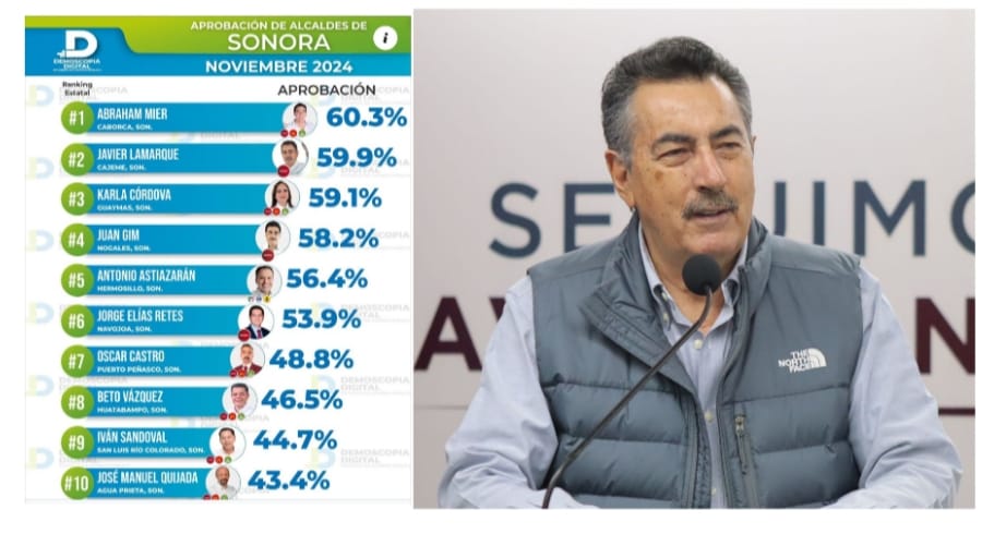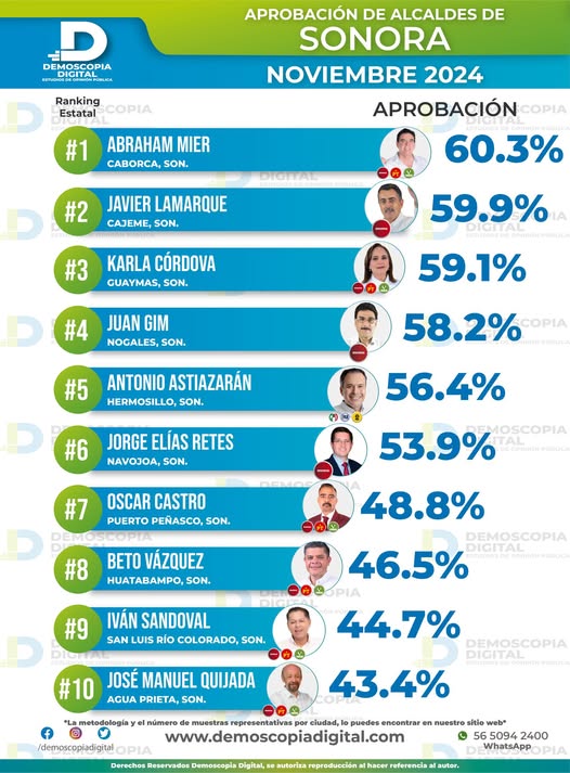 En su portal de resultados del mes de noviembre, Demoscopia Digital, destaca la aprobación de los alcaldes de Sonora, donde el munícipe cajemense, aumentó el porcentaje de aprobación asi como también en ranking nacional por los altos niveles de eficiencia del municipio de Cajeme entre los ayuntamientos del país.