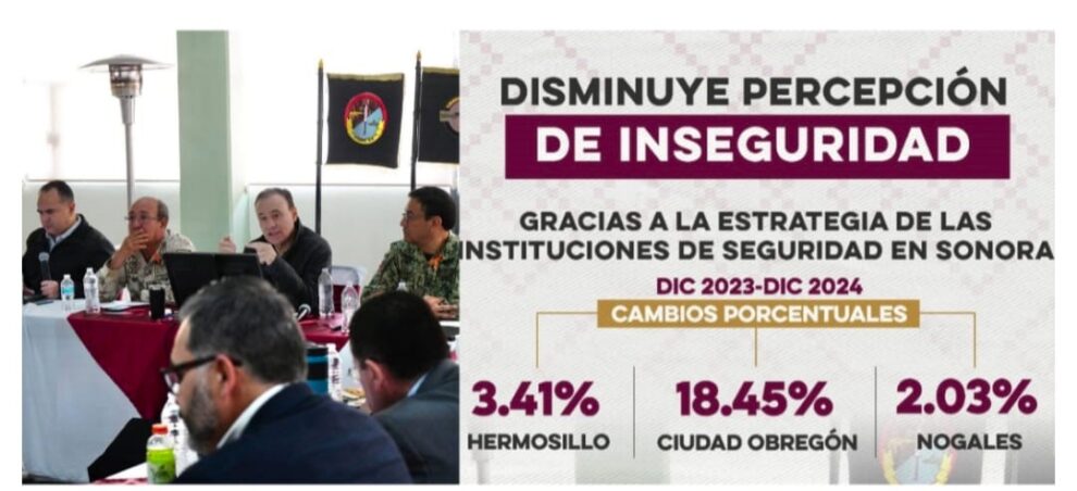 HERMOSILLO, SONORA 23 DE ENERO DE 2025.- Como resultado de la estrategia implementada por el gobernador Alfonso Durazo, se ha registrado una reducción en la percepción de inseguridad de los habitantes de los municipios de Hermosillo, Nogales y Cajeme, siendo este último el que presentó la mayor disminución, con un 18.4%, según los índices publicados por la Encuesta Nacional de Seguridad Pública Urbana (ENSU) del INEGI.