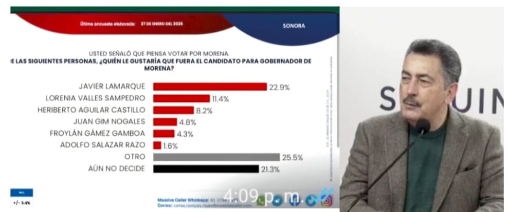 CIUDAD DE MÉXICO 27 DE ENERO DE 2025.- Los resultados actuales de  la casa encuestadora Massive Caller, correspondiente al mes de enero, han puesto  al alcalde de Cajeme Javier Lamarque Cano, en la preferencia  de su partido MORENA, para que sea el que contienda a la gubernatura de Sonora en el 2027.