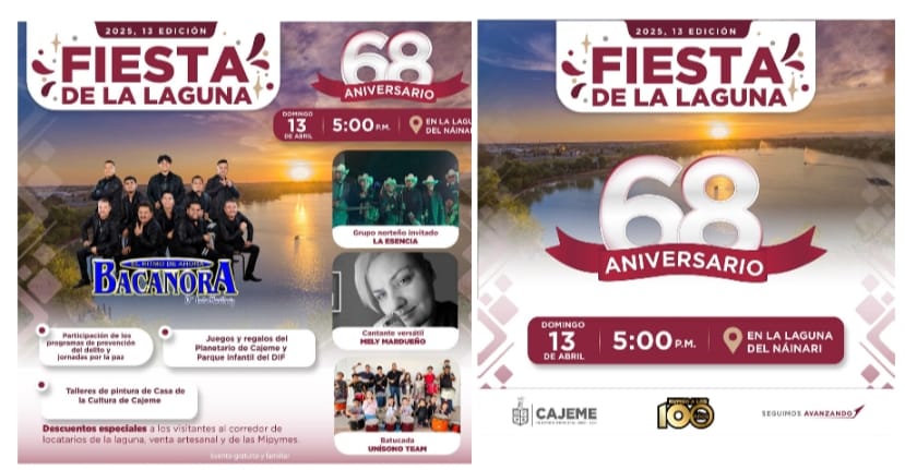 DE ABRIL DE CIUDAD OBREGÒN, SONORA . Música en vivo con temática de cumbias, norteña y versátil, además de batucada, dinámicas de juegos, stands informativos sobre diversos servicios del Ayuntamiento, MIPYIMES, regalos y muchas sorpresas más, es lo que podrán disfrutar las y los asistentes que visiten la Laguna del Náinari durante este próximo domingo 13 de abril, lo anterior, como parte de los festejos por el 68 aniversario de la “Novia de Cajeme”.