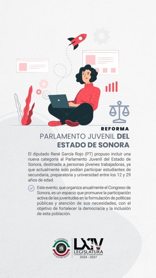 Hermosillo, Sonora; 22 de abril de 2025.- Con el propósito de fortalecer la inclusión y representatividad dentro del Parlamento Juvenil del Congreso de Sonora, el diputado René García Rojo (PT) presentó una iniciativa para adicionar una categoría dirigida específicamente a personas jóvenes trabajadoras. Indicó que la propuesta busca garantizar que la voz de este sector también sea escuchada y tomada en cuenta en los procesos legislativos.