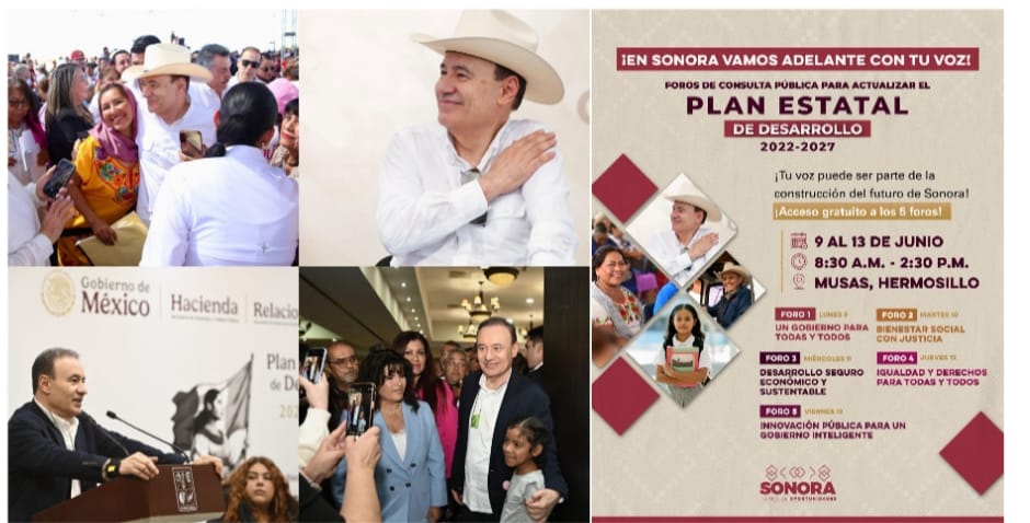 El mandatario estatal dará inicio en Sonora a la siguiente fase de los foros de consulta pública para actualizar el Plan Estatal de Desarrollo 2022-2027, con el propósito de armonizar las acciones del Gobierno de Sonora con el Plan Nacional de Desarrollo 2025-2030.