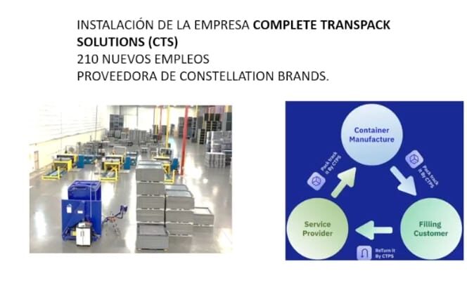 Asimismo, dio a conocer la instalación de Complete Transpack Solutions (CTS), proveedora de Constellation Brands, que se establecerá en la avenida Francisco Villa y calle 12, con una inversión de 36 millones de pesos, esta empresa creará 210 nuevos empleos en una nave industrial de 5 mil metros cuadrados.