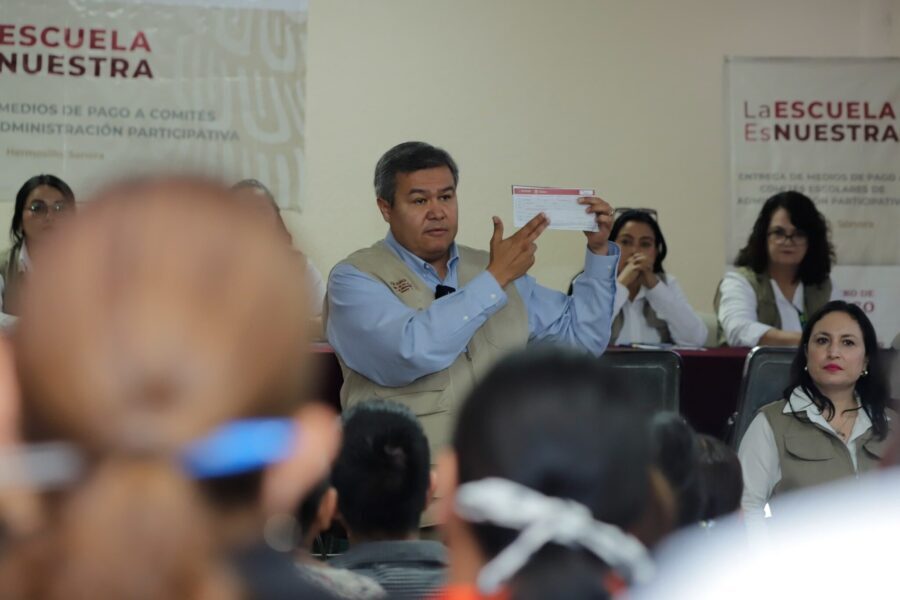 • El Delegado de Bienestar en Sonora, Octavio Almada Palafox, entregó tarjetas a 75 comités escolares del Programa La Escuela es Nuestra en territorio Yaqui, quienes recibirán más de 20 millones 900 mil pesos.