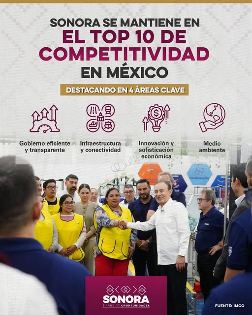 El mandatario sonorense subrayó que en el índice de competitividad estatal 2025, la entidad ocupa el lugar número 9 a nivel nacional, sobresaliendo en los rubros de gobierno eficiente y transparente; infraestructura y conectividad; innovación y sofisticación económica y medio ambiente.