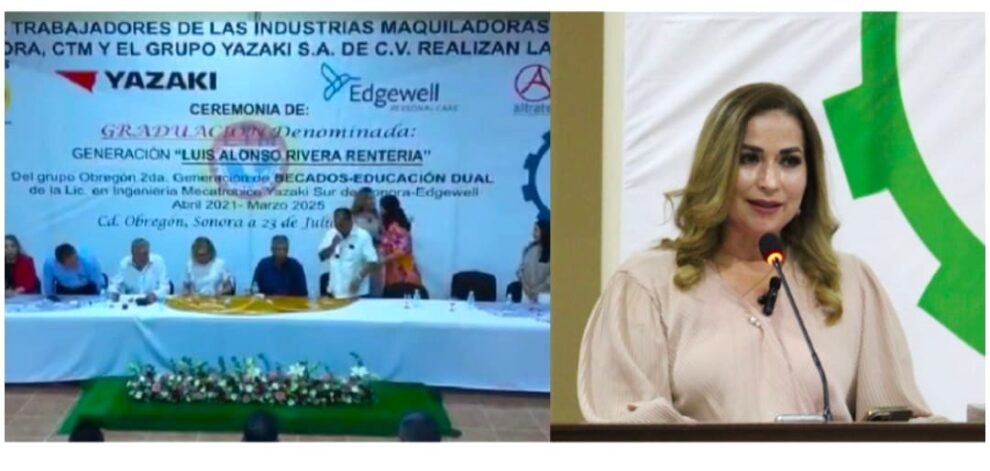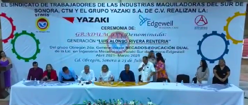 CIUDAD OBREGÓN, SONORA 24 DE JULIO DE 2025  Marina Herrera Ortiz, Secretaria de la Mujer  en Cajeme, resaltó el trabajo de la CTM y del  esfuerzo al que se ha estado sumando el sector empresarial para  que se fomente e impulse la Educación Dual, un modelo que genera condiciones para elevar el nivel de especialización  y competitividad de los trabajadores, luego de  asistir   en representación del alcalde Javier Lamarque Cano, a la Ceremonia de Graduación Generación  ´´Luis Alonso Rivera Rentería´´, del Grupo Obregón, Segunda Generación Becados  Educación Dual de la Licenciatura en Ingeniería Mecatrónica  evento organizado por  el Sindicato de  Maquiladoras del Sur de Sonora , CTM  y Yazaki Sur de Sonora Edgewell.
