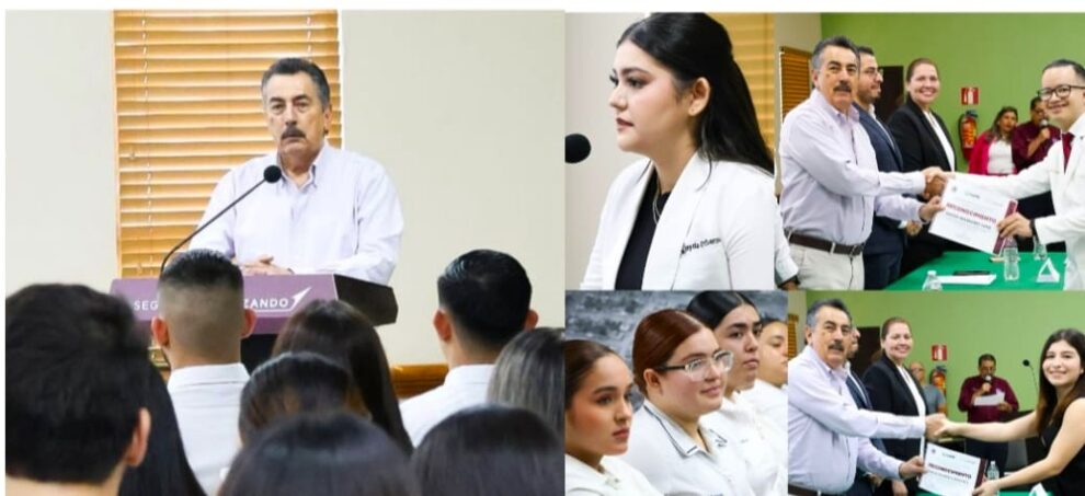 CIUDAD OBREGÓN, SONORA 31 DE JULIO DE 2025.- El Presidente Municipal, Javier Lamarque, en coordinación con la Dirección de Salud, reconoció a 42 pasantes de Medicina, Enfermería, Nutrición y Fisioterapia, quienes durante un año prestaron su servicio social en las unidades médicas del Ayuntamiento de Cajeme, tiempo en el cual atendieron las necesidades de cientos de ciudadanas y ciudadanos en sus respectivos campos profesionales.
