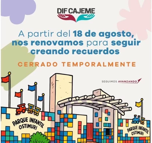 CIUDAD OBREGÓN, SONORA 14 DE AGOSTO DE 2025.-El Sistema DIF Cajeme informa que a partir del 18 de agosto de 2025, el Parque Infantil Ostimuri permanecerá cerrado temporalmente para dar inicio a un importante proyecto de renovación, con el objetivo de ofrecer a las familias un espacio más seguro, moderno y atractivo.