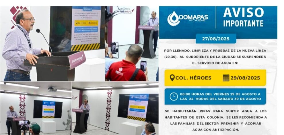 CIUDAD OBREGÓN, SONORA 27 DE AGOSTO DE 2025.- El OOMAPAS de Cajeme informa a las y los vecinos de la colonia Los Héroes que el servicio de agua potable será suspendido por un período de 48 horas, a partir de las 00:00 horas del viernes 29 de agosto y hasta las 24:00 horas del sábado 30 de agosto, dicha medida se debe a trabajos técnicos de llenado, limpieza, desfogue y pruebas en la nueva línea del aquaférico Suroriente.