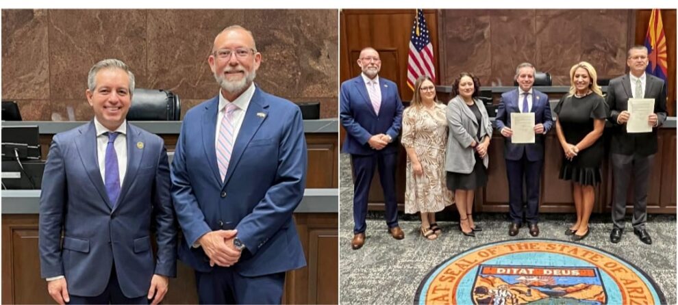 Phoenix, Arizona; 28 de agosto de 2025.- Con el objetivo de fortalecer la cooperación bilateral entre Sonora y Arizona, el diputado Omar Francisco Del Valle Colosio (PVEM), presidente del Congreso del Estado de Sonora, y Tony Rivero, presidente del Comité de Comercio Internacional de la Cámara de Representantes de Arizona, firmaron un Memorándum de Entendimiento (MdE)..
