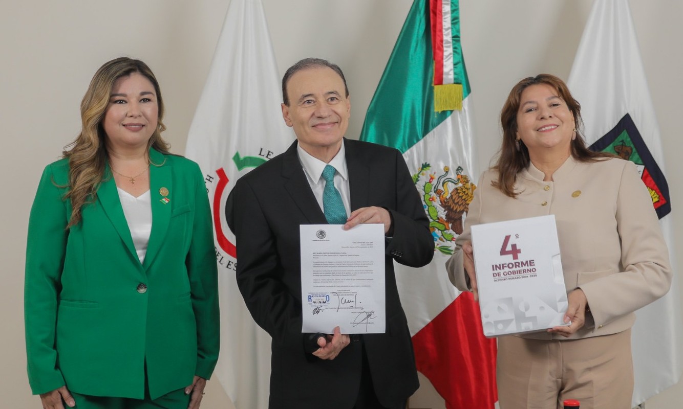 Hermosillo, Sonora; 13 de septiembre de 2025.- En representación del Poder Legislativo, la diputada María Eduwiges Espinoza Tapia, presidenta de la Mesa Directiva del Congreso del Estado de Sonora, recibió el Cuarto Informe de Gobierno, entregado por el gobernador Alfonso Durazo Montaño, en cumplimiento de lo dispuesto por la Constitución Política del Estado.