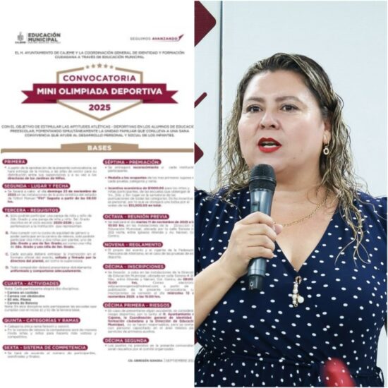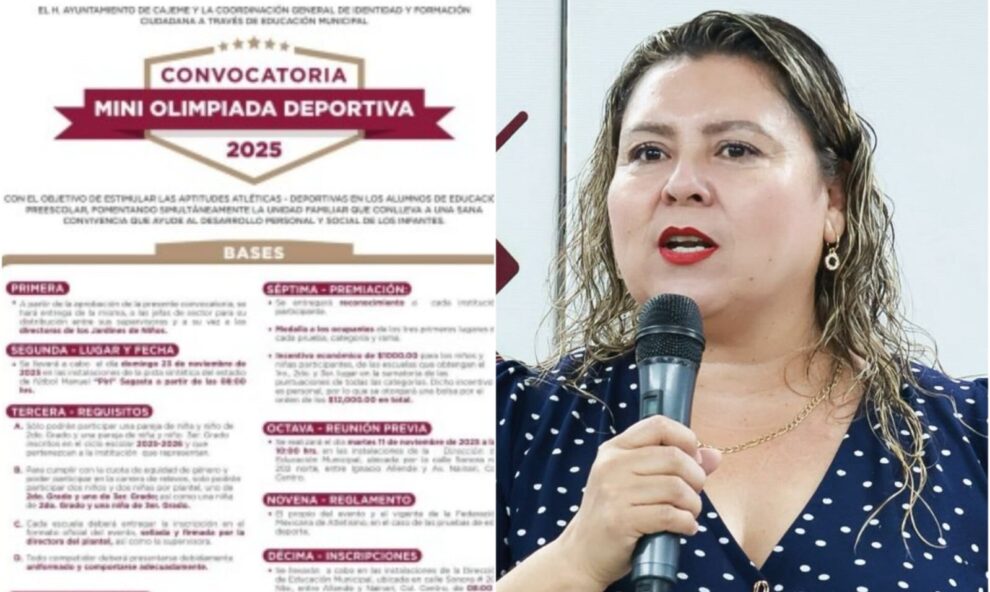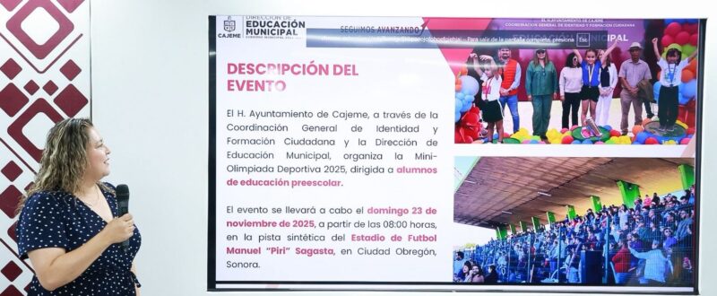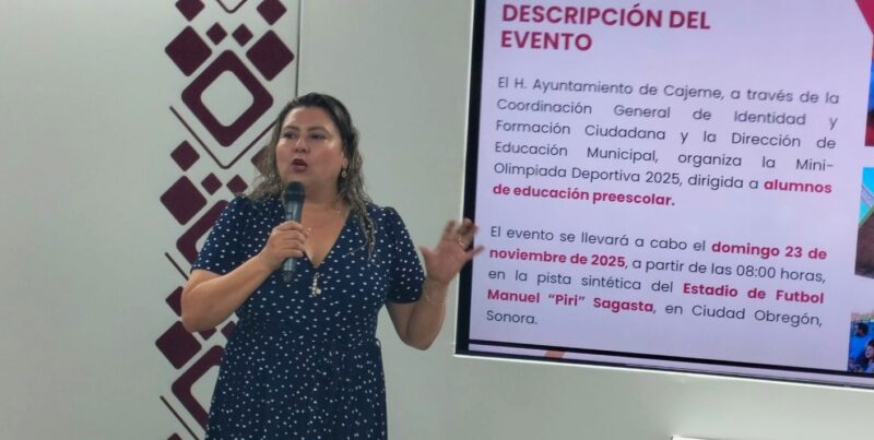 CIUDAD OBREGÓN, SONORA 2 DE OCTUBRE DE 2025.- Para estimular las aptitudes atléticas y fomentar la sana convivencia en las y los alumnos de educación preescolar, el H. Ayuntamiento de Cajeme, a través de la Coordinación General de Identidad y Formación Ciudadana y la Dirección de Educación Municipal, invitan a la convocatoria de la doceava edición de “Mini-Olimpiada Deportiva 2025”, que se llevará a cabo el domingo 23 de noviembre de 2025, a partir de las 08:00 horas en la pista sintética del Estadio de Fútbol Manuel “Piri” Sagasta.